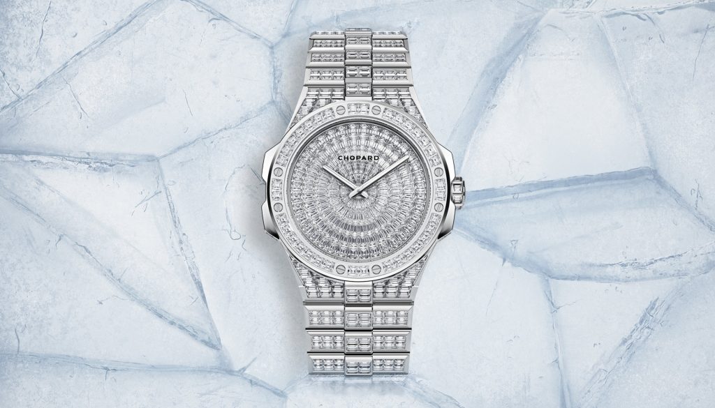 La collezione Alpine Eagle accoglie un nuovo modello di straordinaria raffinatezza che abbina il savoir-faire della Maison nel campo dell’orologeria e della gioielleria, insignito dal Punzone di Ginevra. Ogni minima superficie della cassa di 41 millimetri di diametro, del quadrante, della lunetta, della corona e del bracciale integrato in oro etico bianco 18 carati è interamente ricoperta di diamanti accuratamente tagliati. Un’autentica sfida che proietta la collezione verso nuovi vertici dell’arte della gioielleria ed evoca la bellezza celeste delle stelle che si riflettono sui ghiacciai. Questo autentico esemplare da collezione non scende a compromessi sul piano tecnico e beneficia del savoir-faire di Chopard in orologeria; il movimento ultrapiatto che ospita, L.U.C 96.41-L a carica automatica con micro-rotore, vanta 65 ore di riserva di carica.