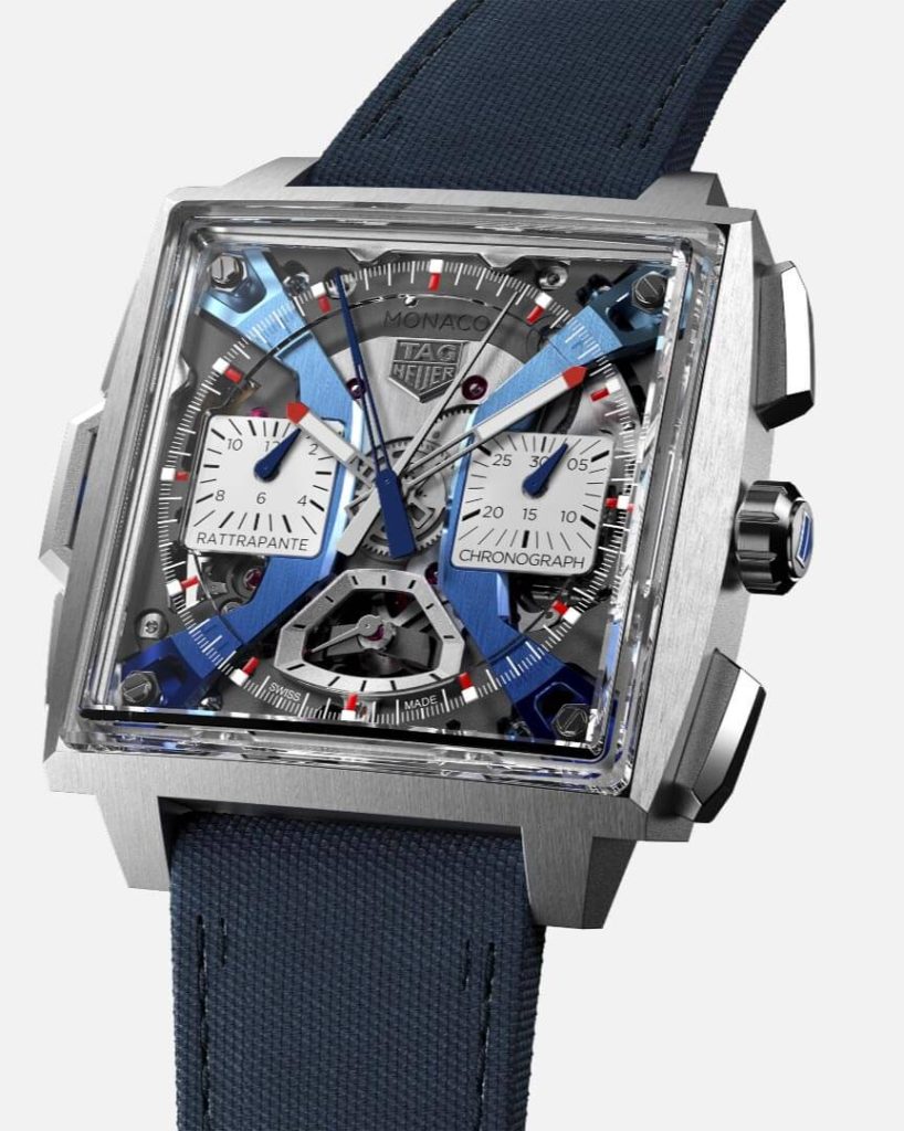 ORIGINAL BLUE Sulla lancetta rattrappante e sul quadrante in titanio, gli archi rendono omaggio al modello Monaco originale del 1969, con un tocco dinamico e moderno.