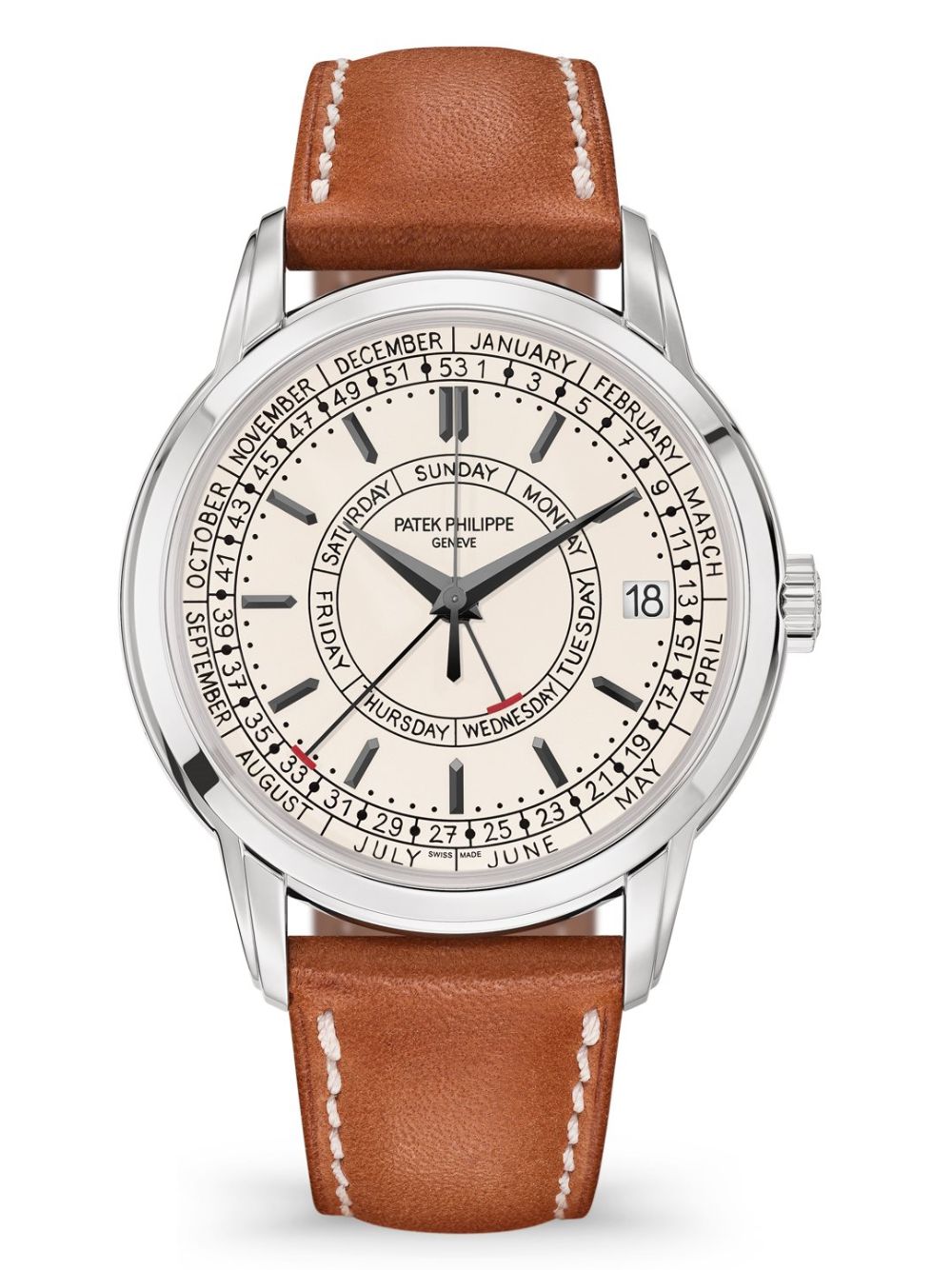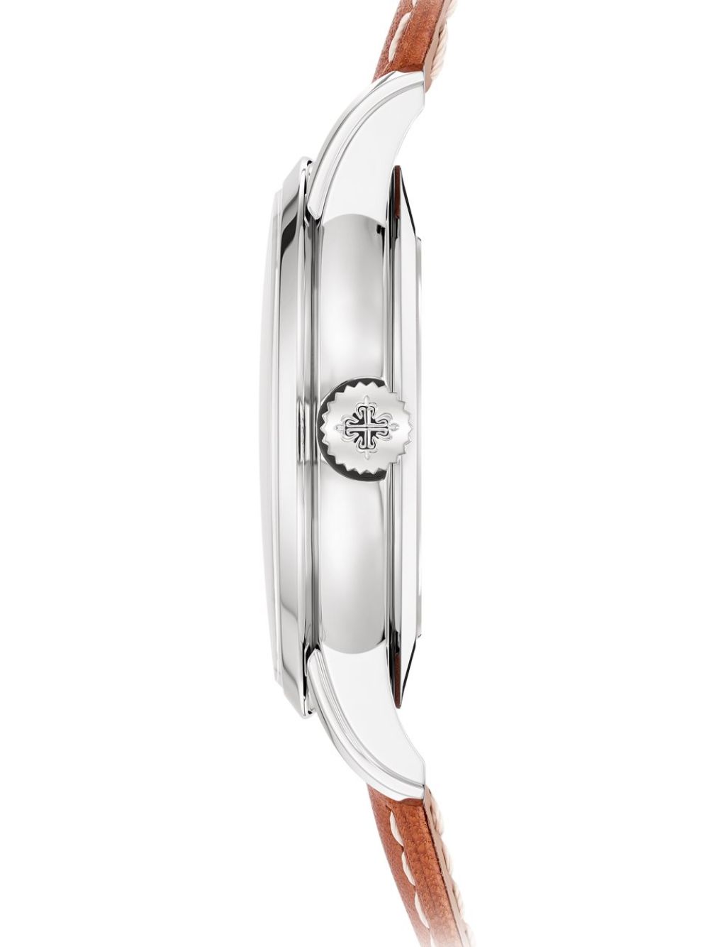 Patek Philippe, Ref. 5212A-001 Complicazioni. Orologio automatico in acciaio con calendario settimanale, quadrante opalino argenté e cinturino in pelle di vitello bruno chiaro. Eleganza funzionale per i professionisti moderni.