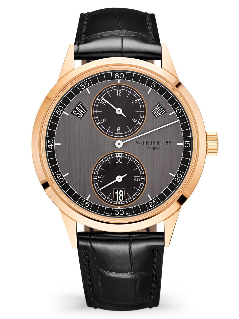 Patek Philippe 5235/50R-00 Regolatore con Calendario Annuale, cassa in oro rosa, quadrante grafite-nero, calibro 31-260 REG QA, cinturino in alligatore nero. Un orologio che unisce eleganza e innovazione tecnica.