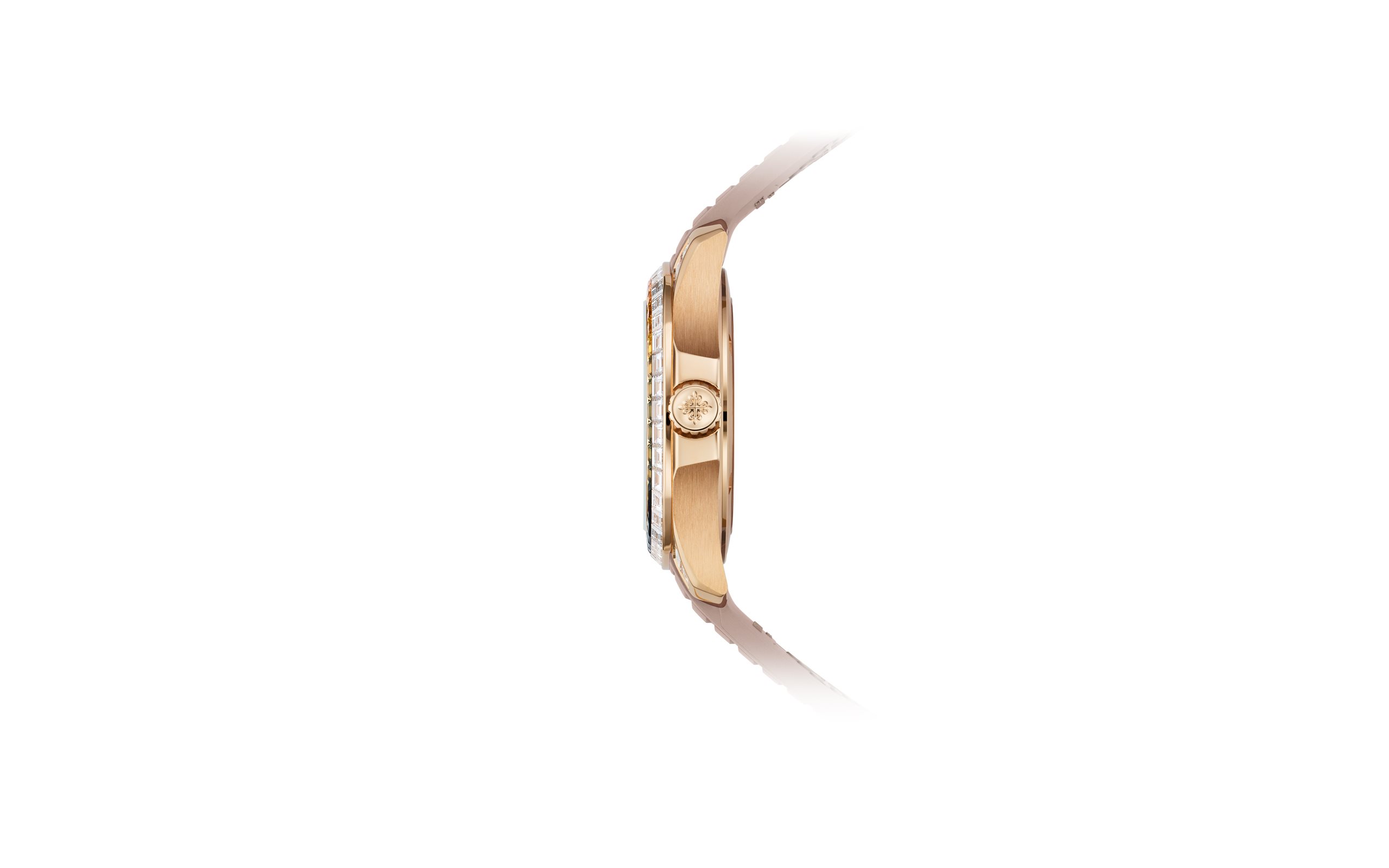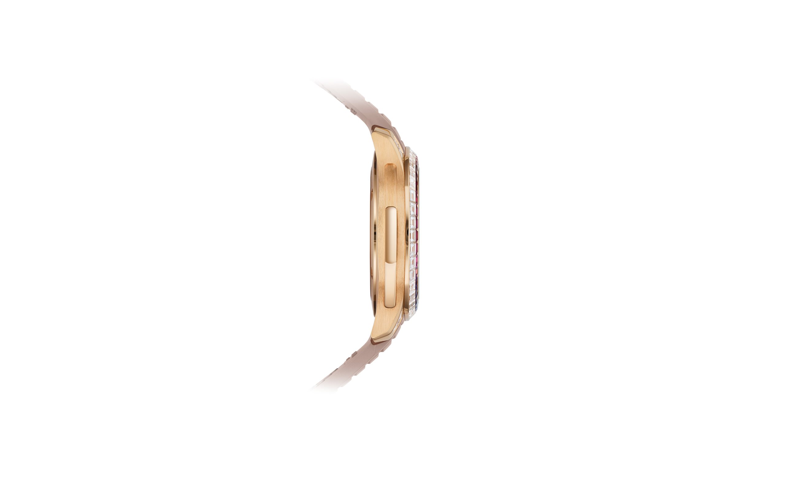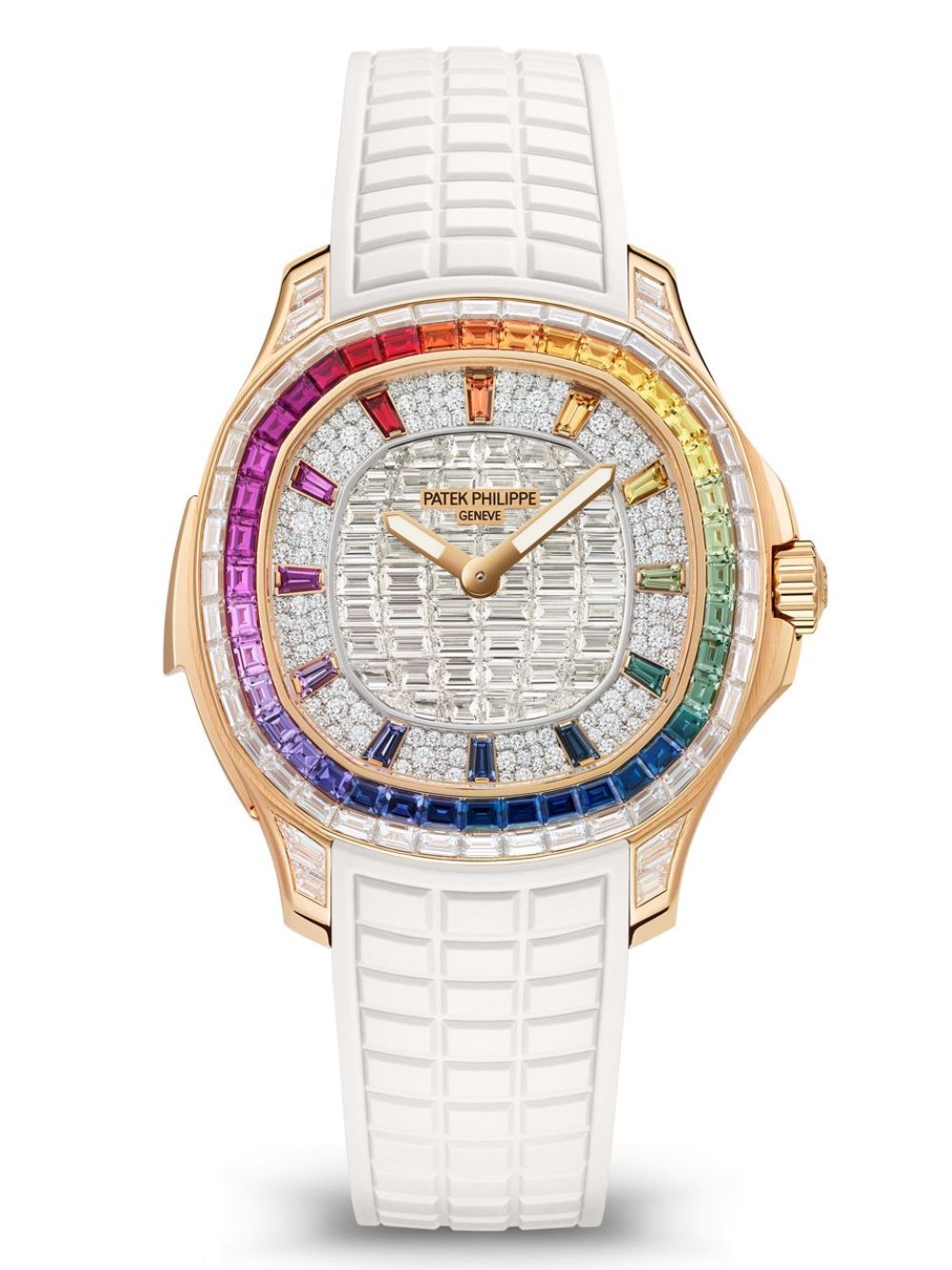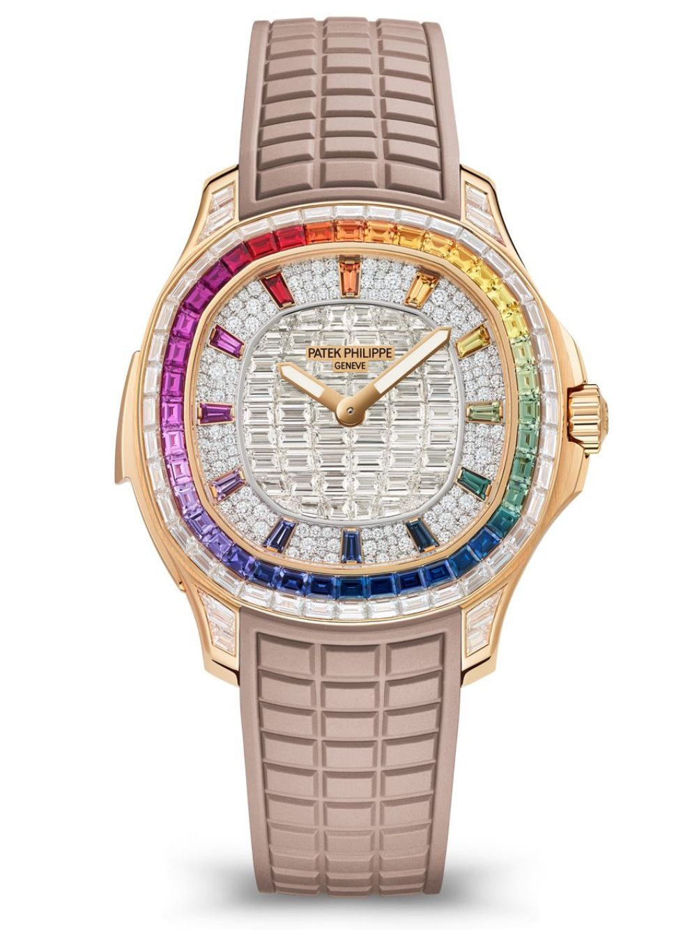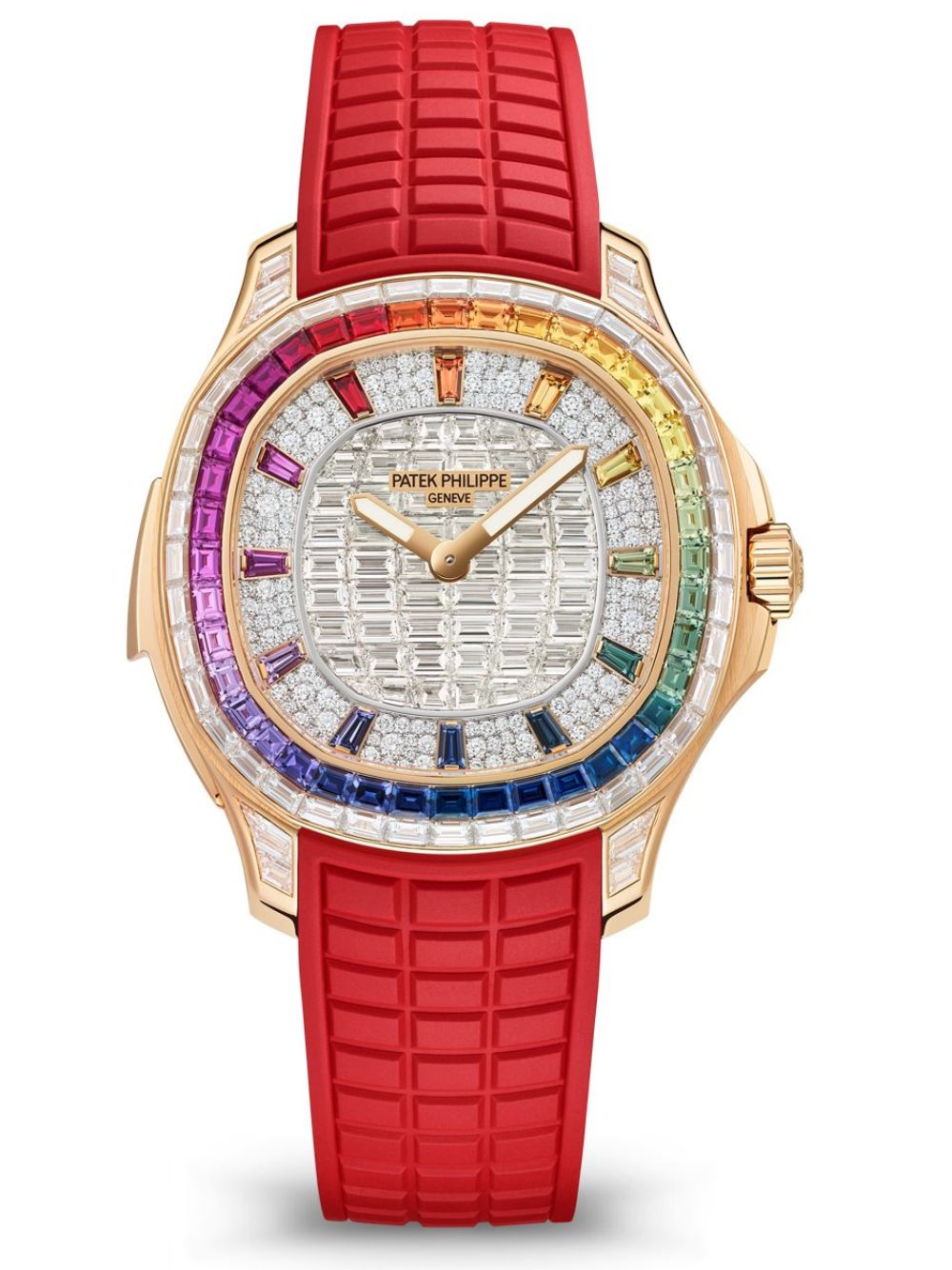 Il primo Aquanaut Luce con ripetizione minuti, la Ref. 5260/355R-001 di Patek Philippe, è reso ancora più prezioso da 52 zaffiri multicolori a baguette (3,19 ct), 112 diamanti a baguette (7,31 ct) e 160 diamanti taglio brillante (0,72 ct). La lunetta e il quadrante con pavé di diamanti e zaffiri multicolori presentano una splendida incastonatura invisibile. Il quadrante è arricchito da un giro delle ore con brillanti effetto neve. Fornito con tre cinturini in materiale composito ultraresistente nei colori beige opaco, bianco opaco e rosso.