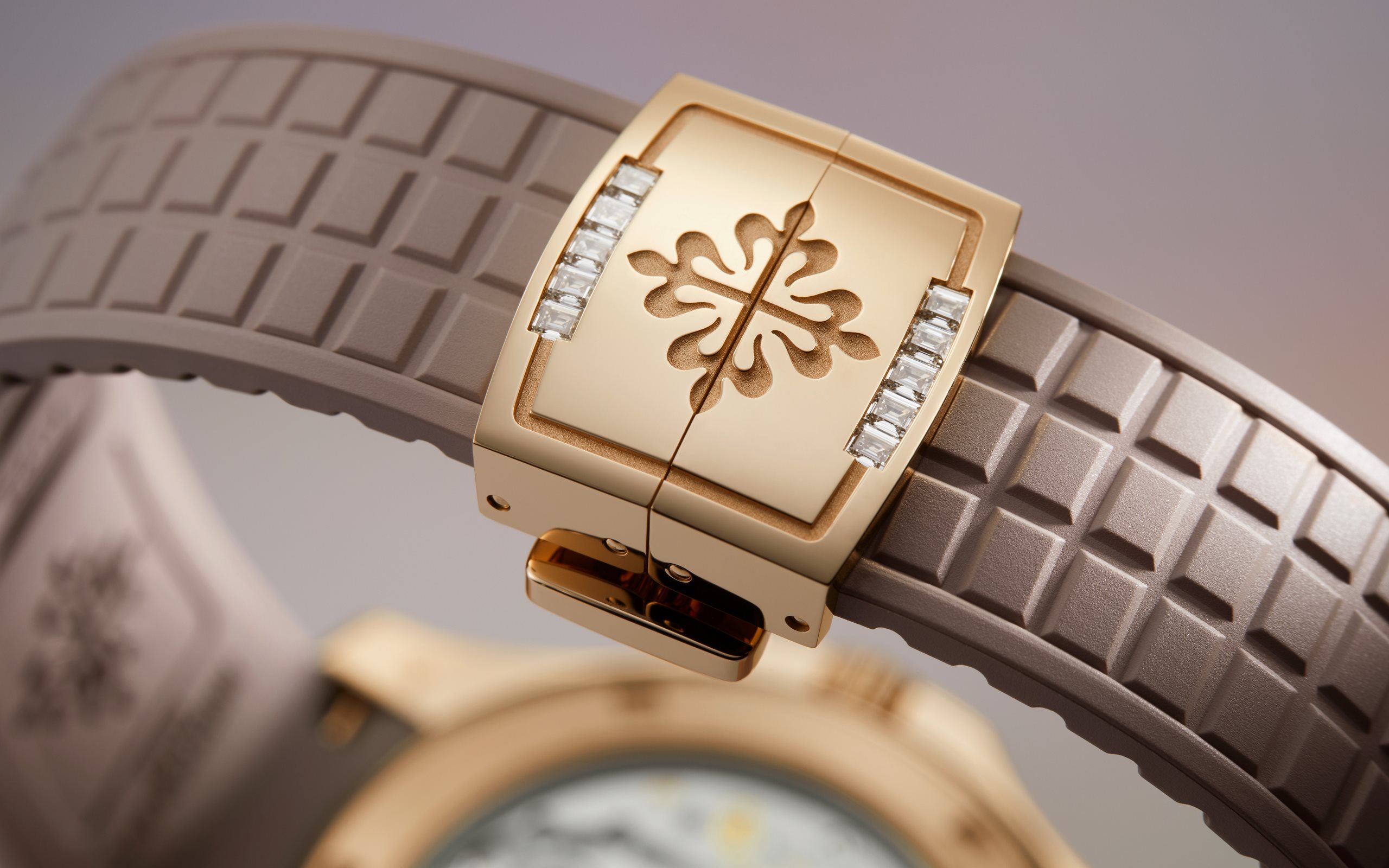 Patek Philippe 5260/355R-001 Aquanaut Luce ripetizione minuti, cassa in oro rosa, diamanti e zaffiri multicolori, calibro R 27, tre cinturini in materiale composito. Un orologio che unisce eleganza e innovazione tecnica.