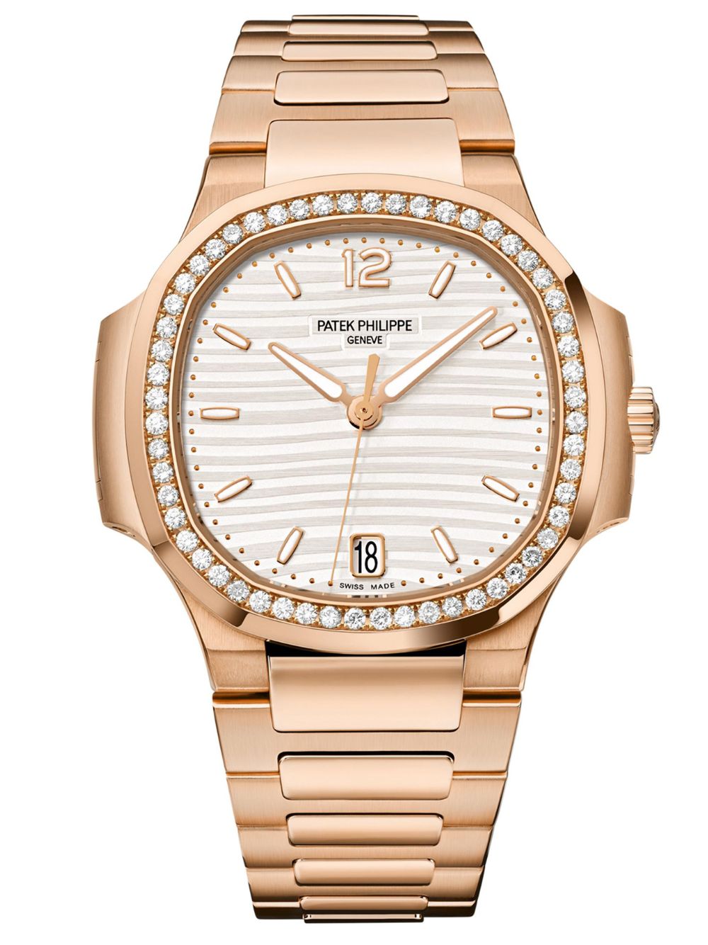 Il Nautilus da Donna in oro rosa, Ref. 7118/1200R-001, unisce lusso e sportività con un quadrante opalescente argenté e una lunetta incastonata con diamanti.