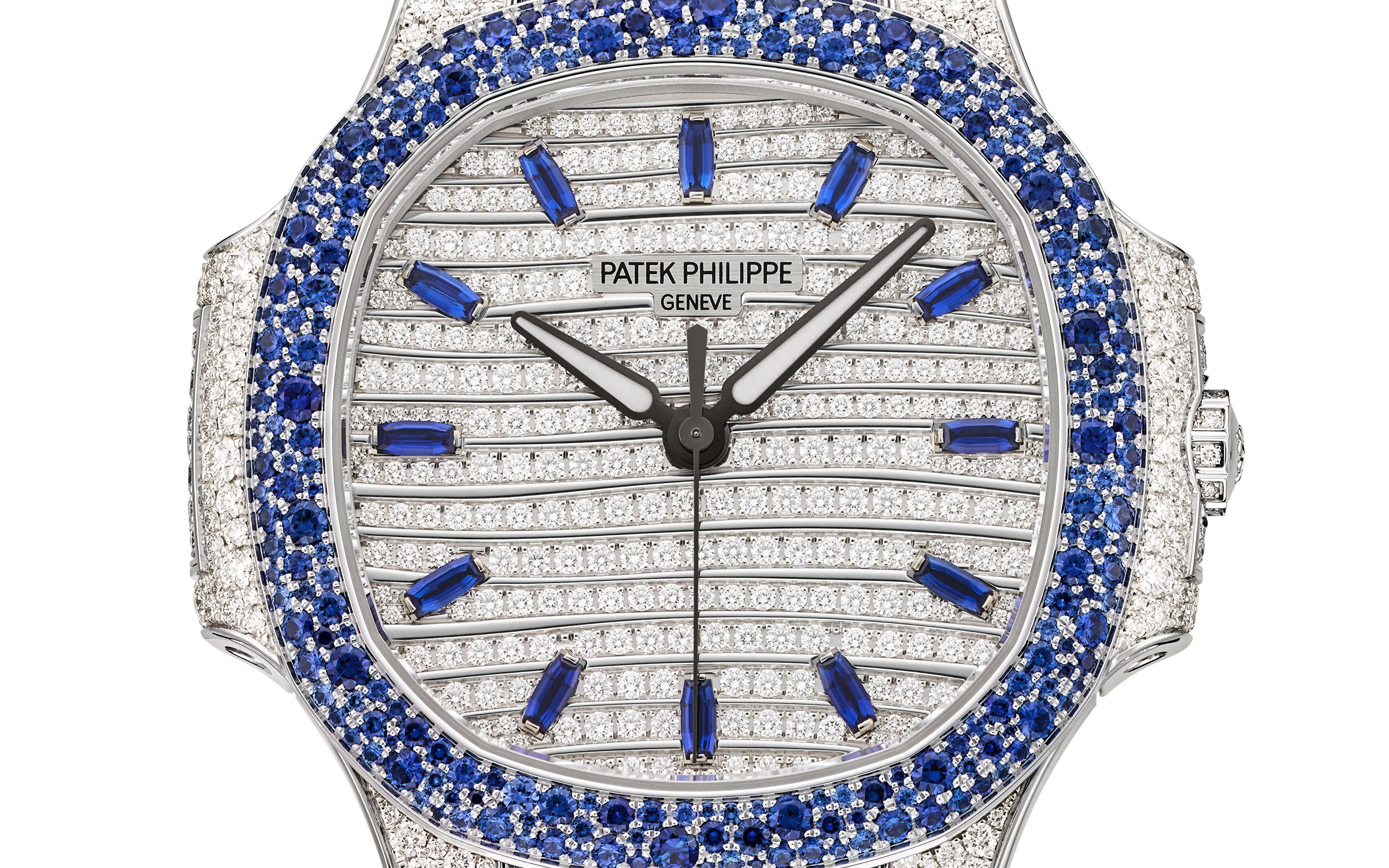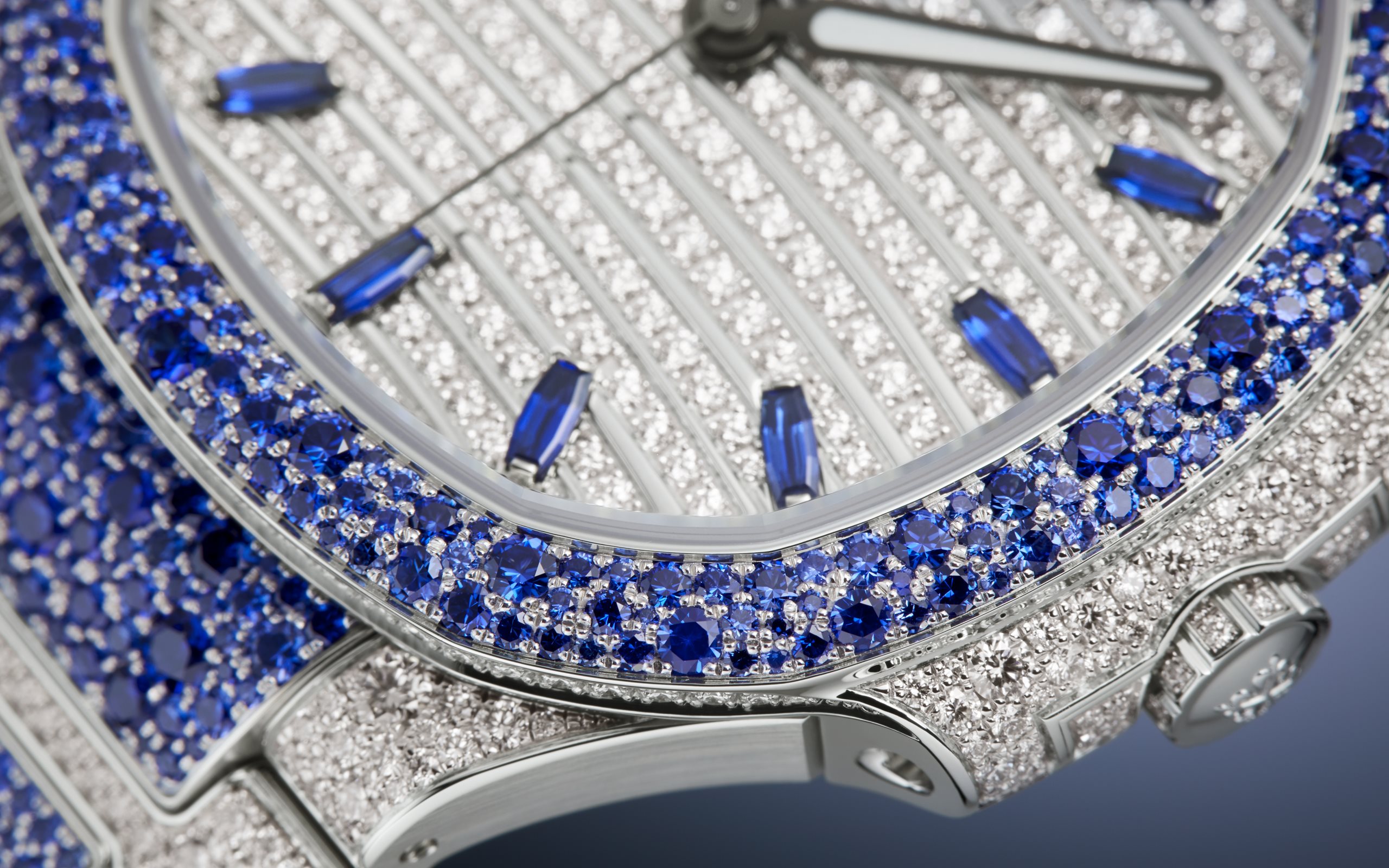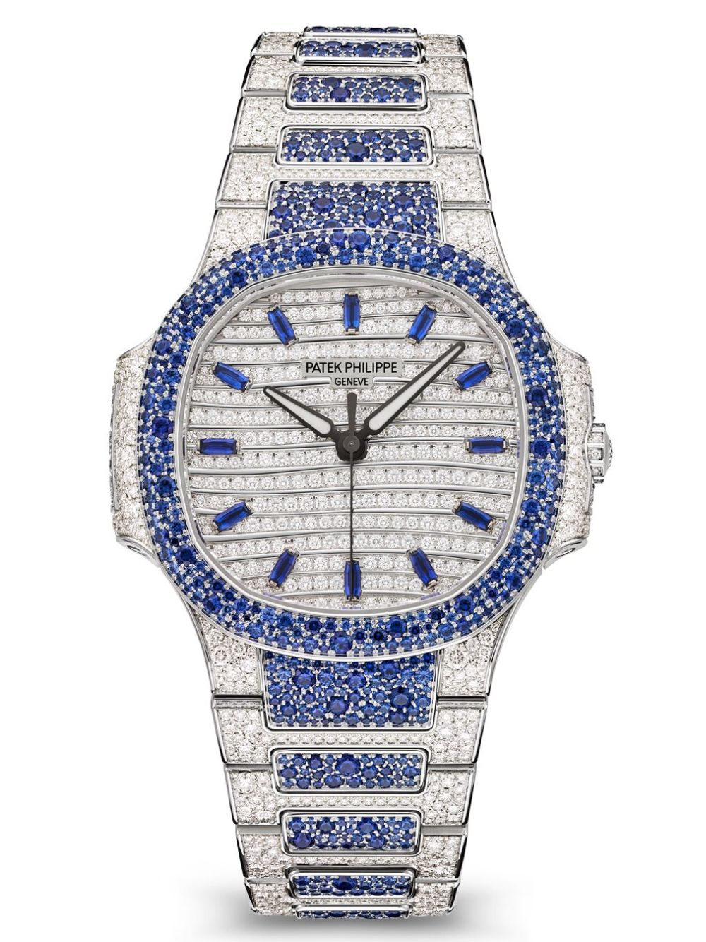 Patek Philippe 7118/1451G-001 Nautilus, cassa e bracciale in oro bianco con diamanti e zaffiri, calibro 26-330 S, quadrante pavé di diamanti. Un`eleganza sofisticata con un tocco di brillantezza.