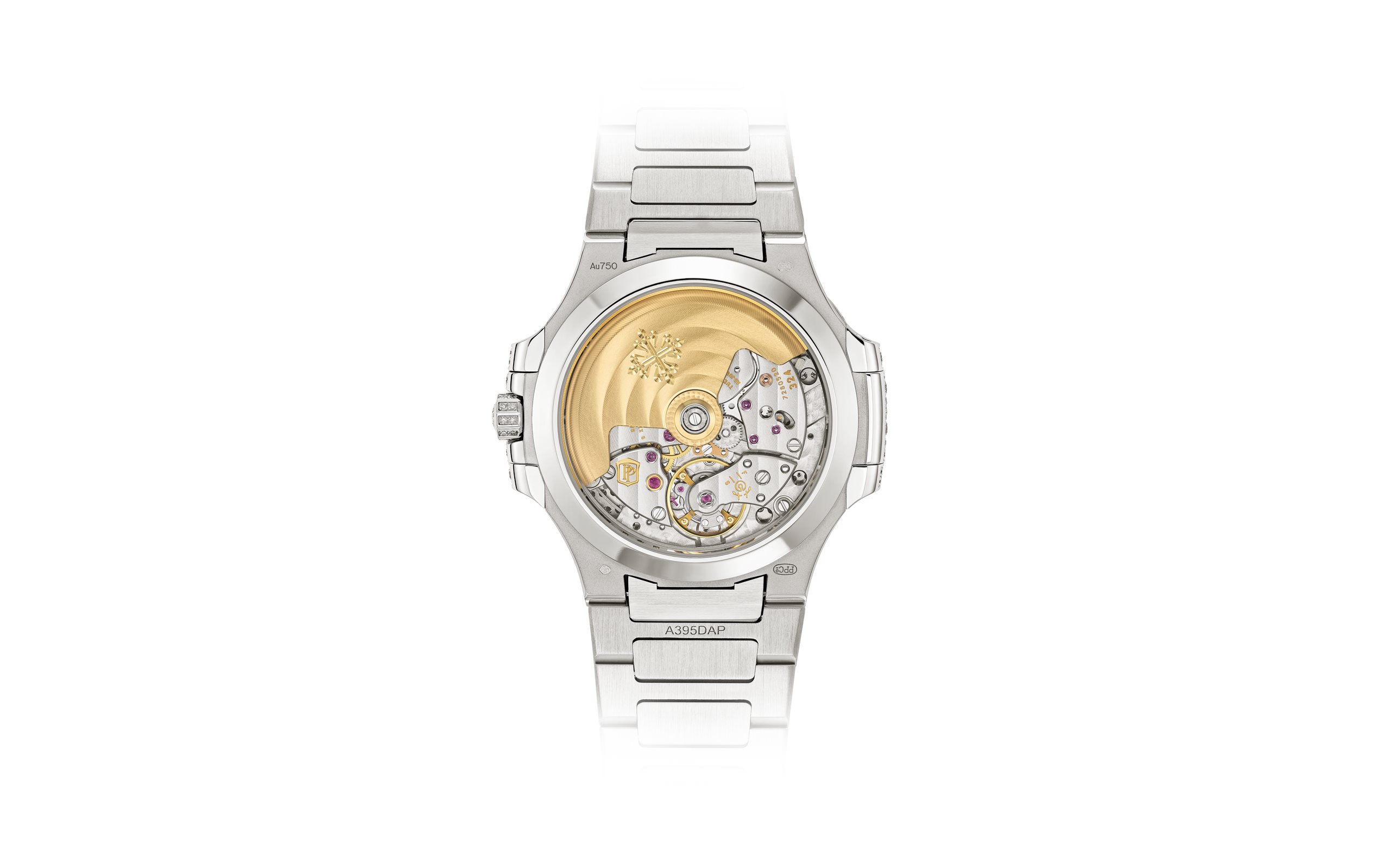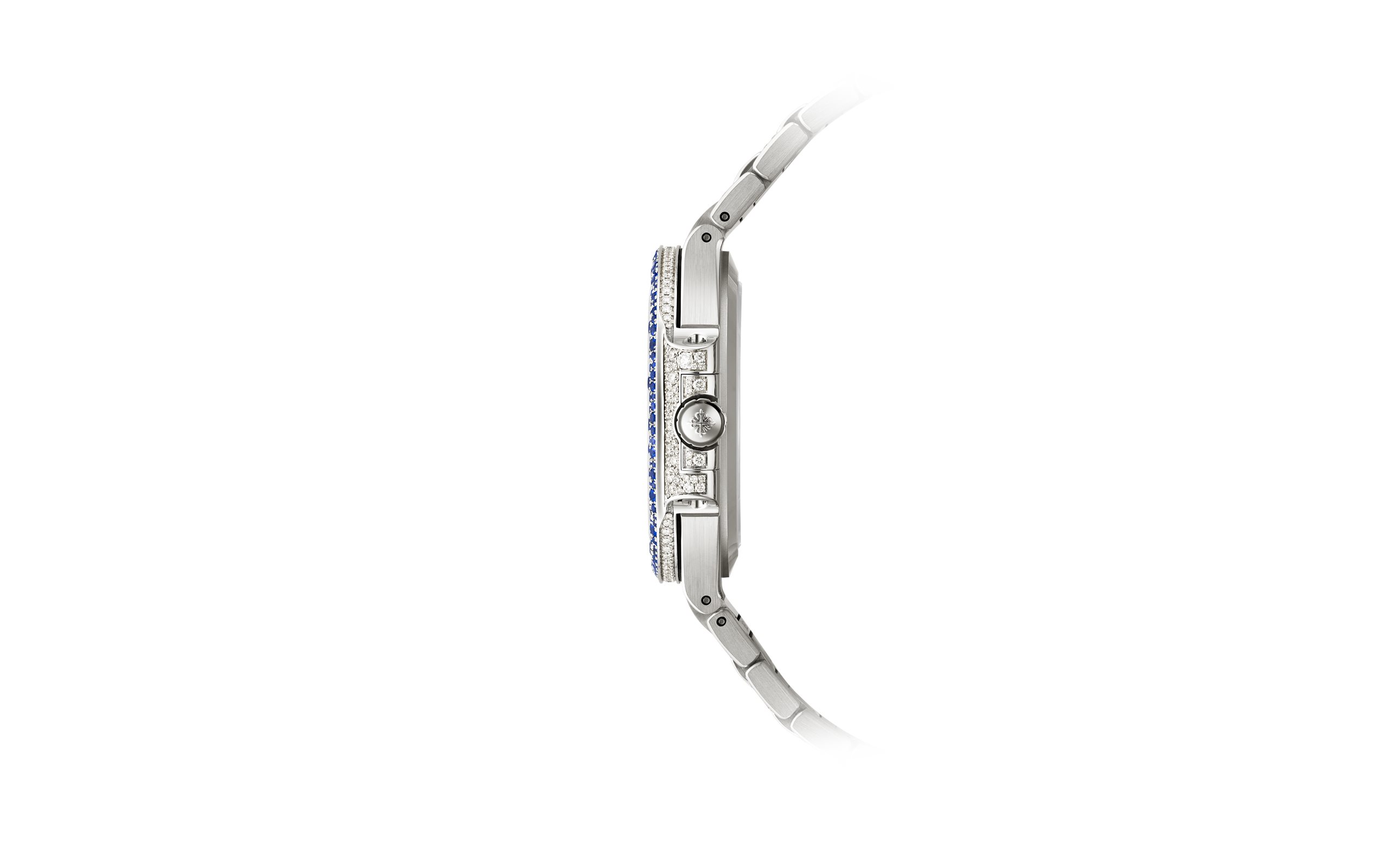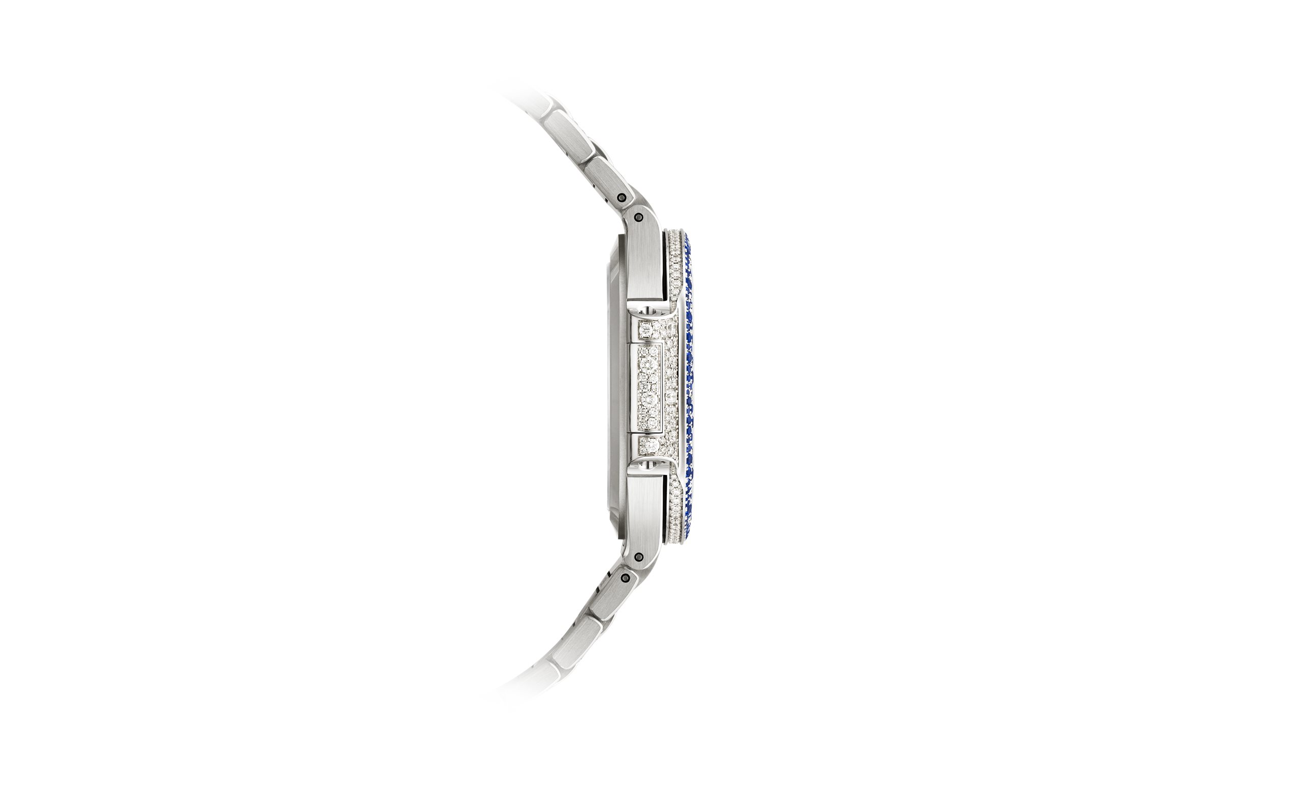 Il Patek Philippe Nautilus Haute Joaillerie Ref. 7118/1451G-001 è un orologio da donna in oro bianco, splendidamente impreziosito da 1500 diamanti taglio brillante (6,53 ct) e 876 zaffiri blu (6,58 ct). Questo capolavoro presenta un quadrante in oro bianco con motivo a onde, arricchito da diamanti e indici con zaffiri blu. Il movimento meccanico a carica automatica calibro 26-330 S è visibile attraverso il fondo in cristallo di zaffiro, mentre il bracciale in oro bianco è dotato di un fermaglio déployant brevettato.
