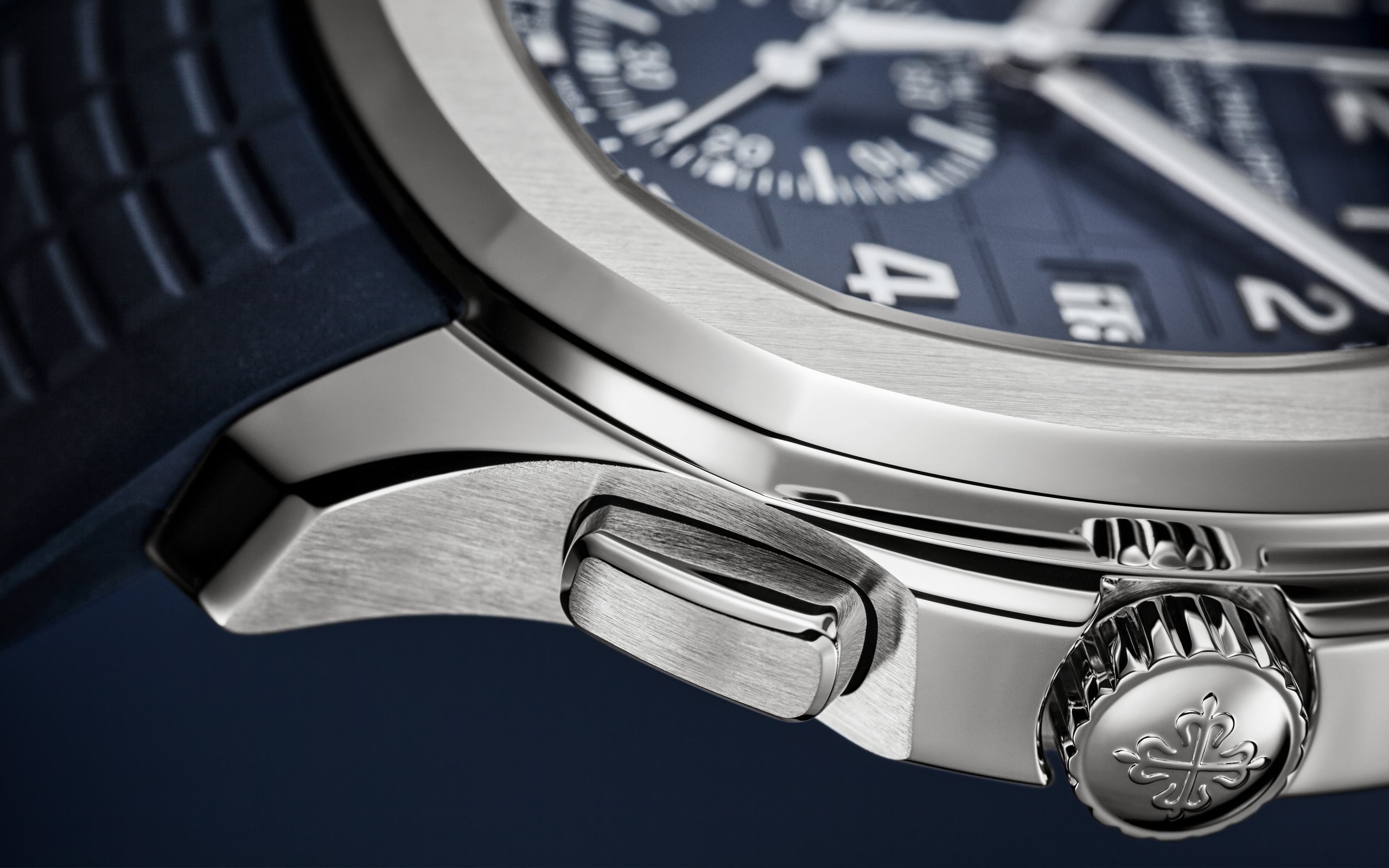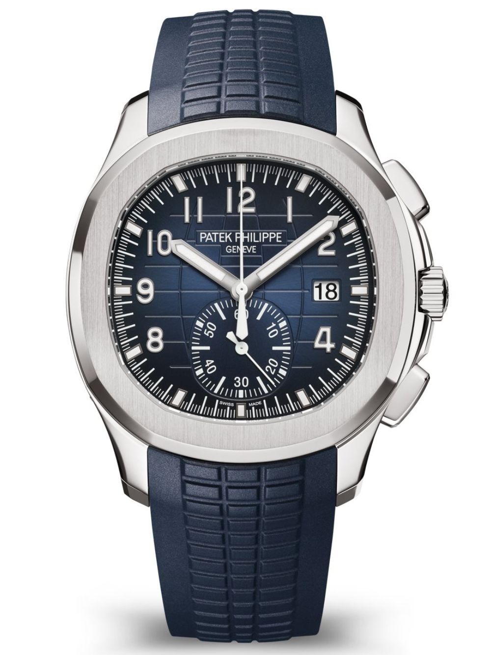 Patek Philippe, orologio, Ref. 5968G-001, collezione Aquanaut. Orologio automatico in oro bianco con cronografo flyback, quadrante blu notte sfumato nero e cinturino in materiale composito abbinato. Design sportivo ed elegante.