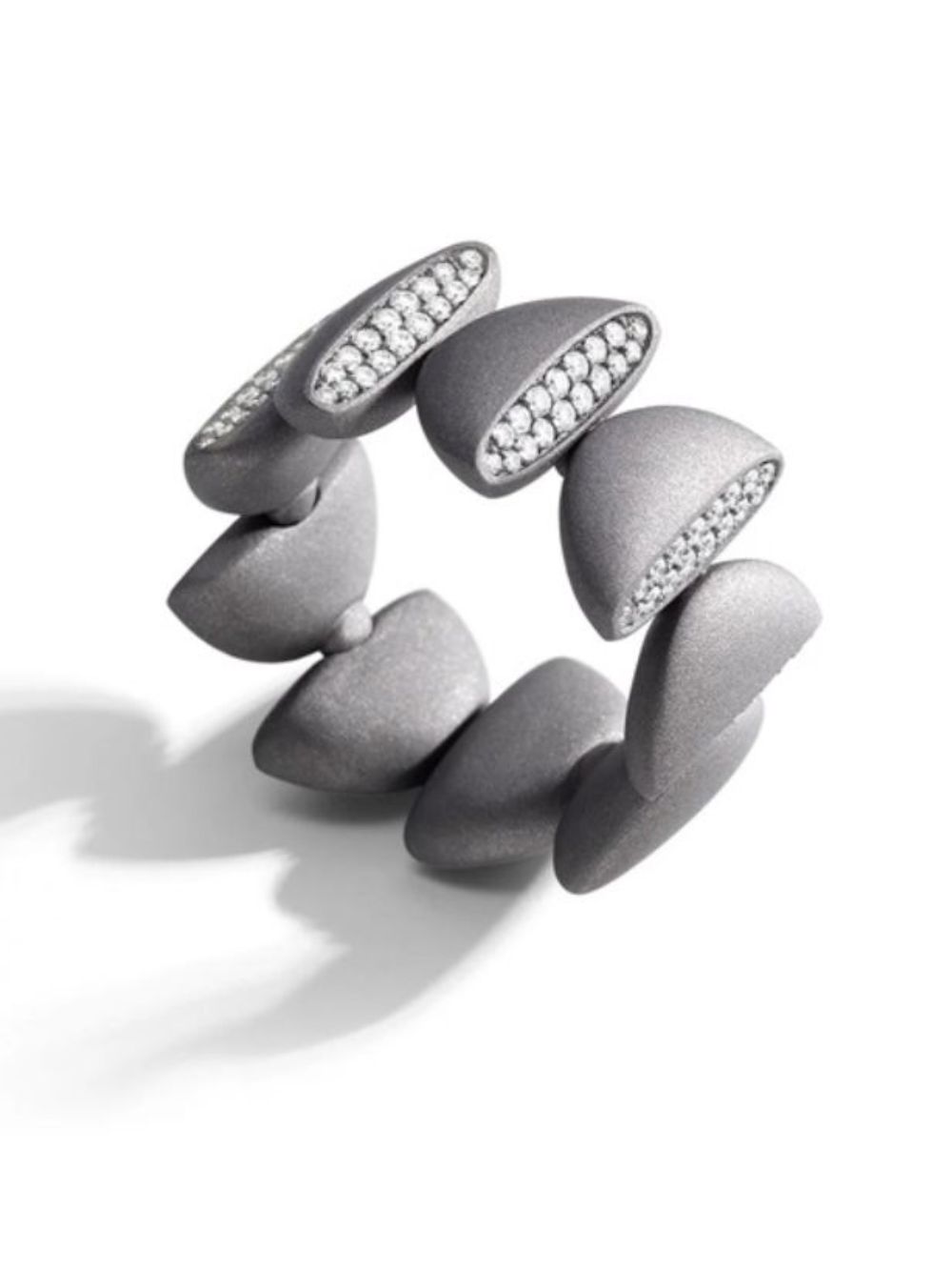 Vhernier, anello Eclisse, cod. TG0979A330. Anello in titanio e 153 diamanti (1,07 ct). Design moderno e sofisticato che unisce la brillantezza dei diamanti alla forza del titanio.