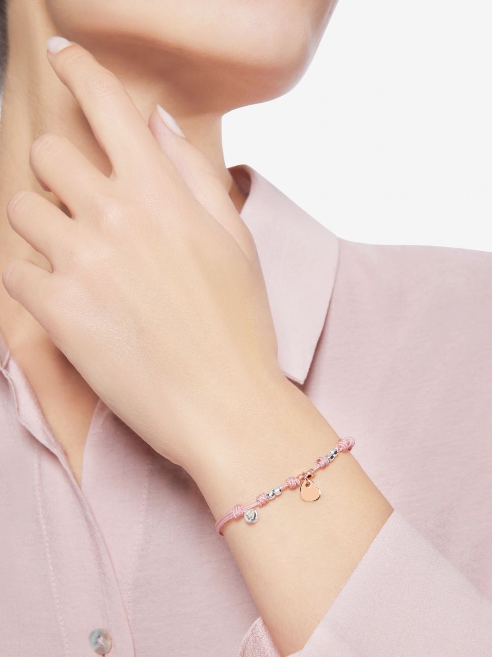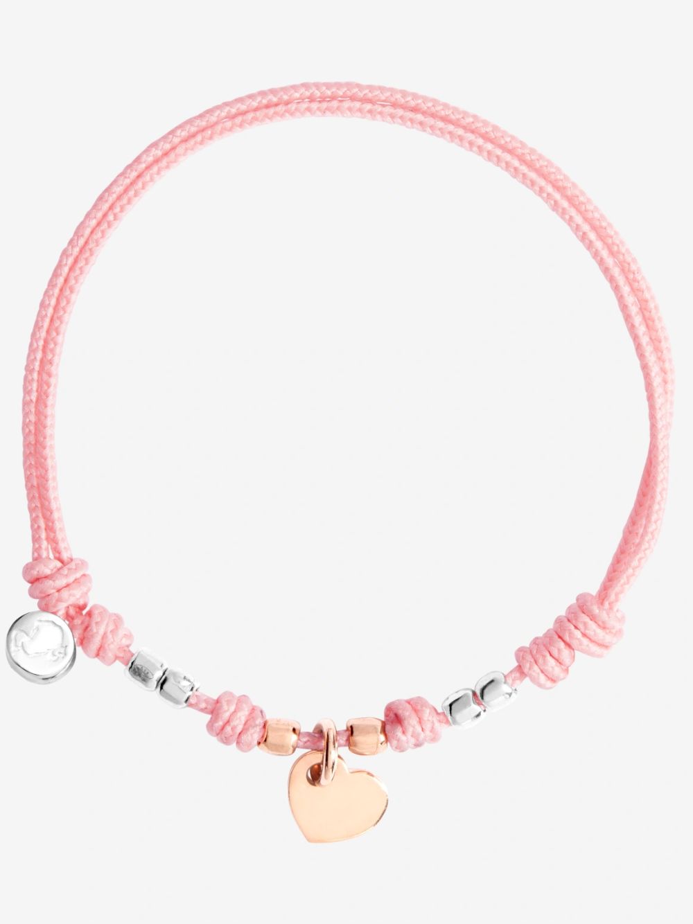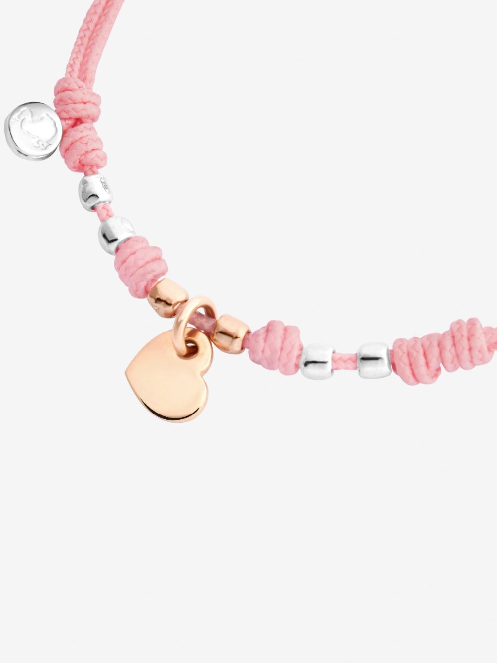 Bracciale con charm Cuore modello mini in oro rosa 9K, quattro mini Granelli in argento 925 e due mini Granelli in oro rosa 9K, cordino rosa e sigillo in argento 925.