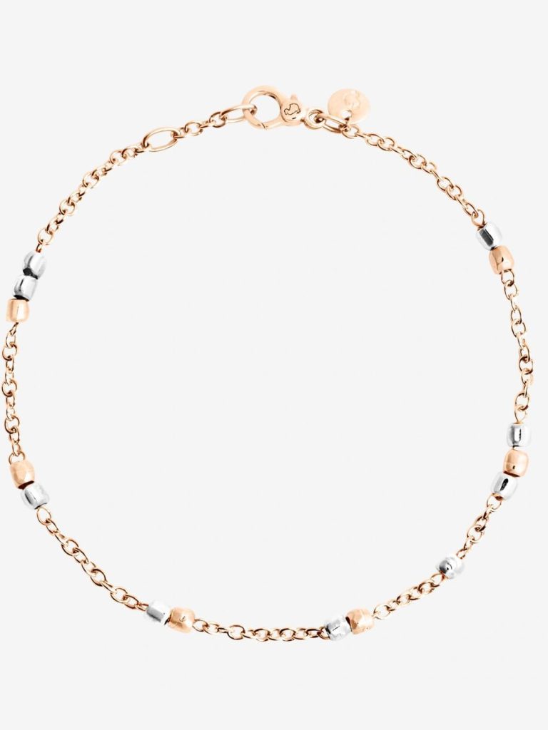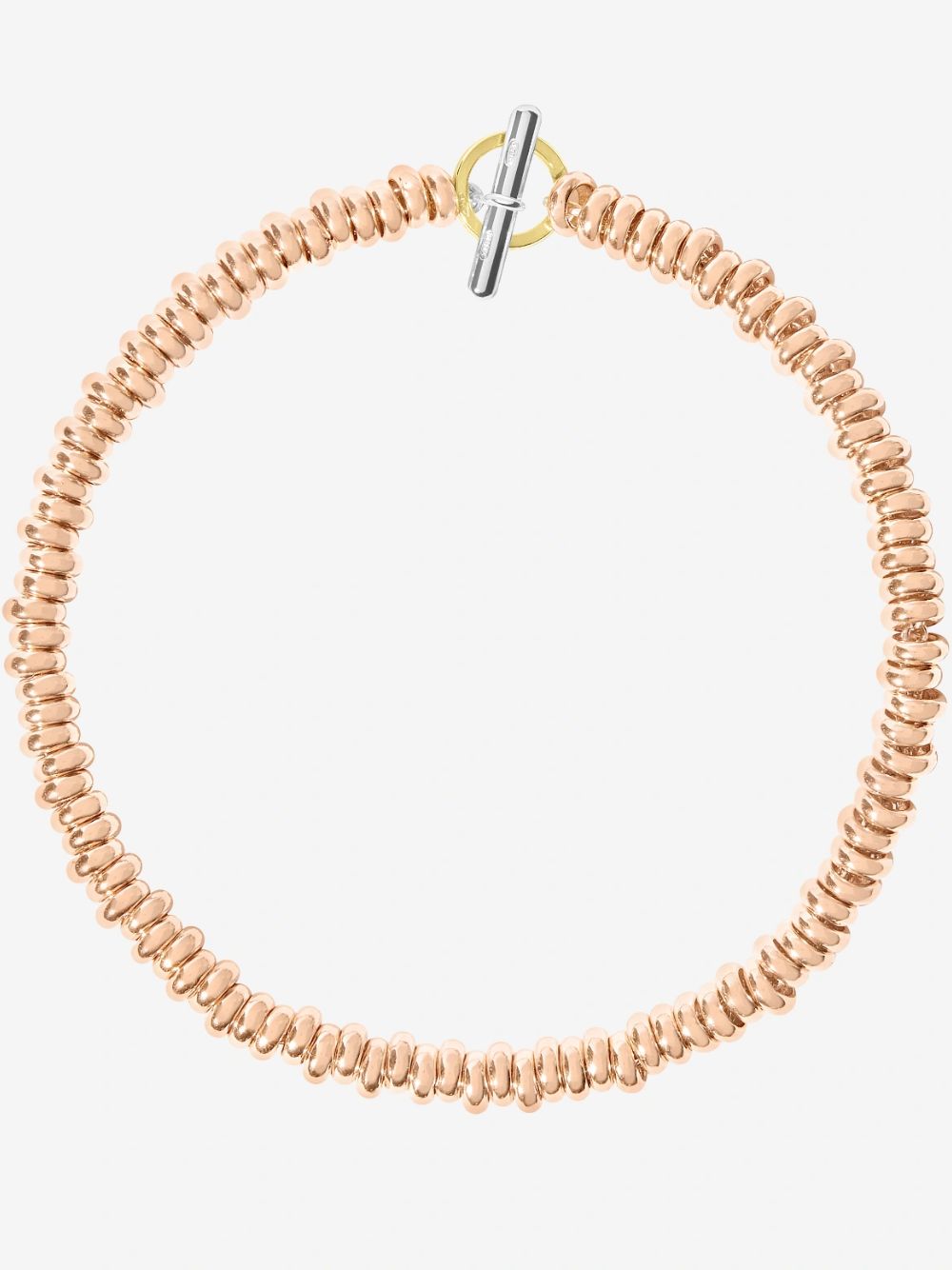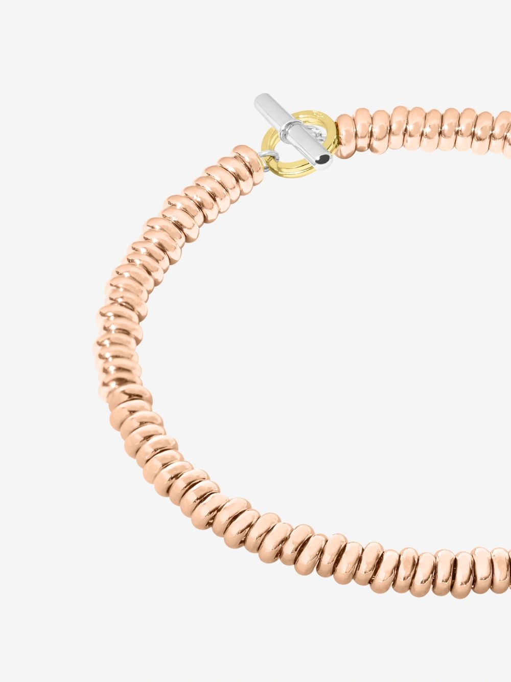 Bracciale rondelle in oro rosa 9K, catena e t-bar in argento 925 e anello brisè in oro giallo 18K. Ago in argento 925 incluso.