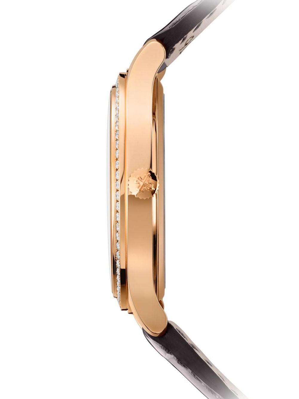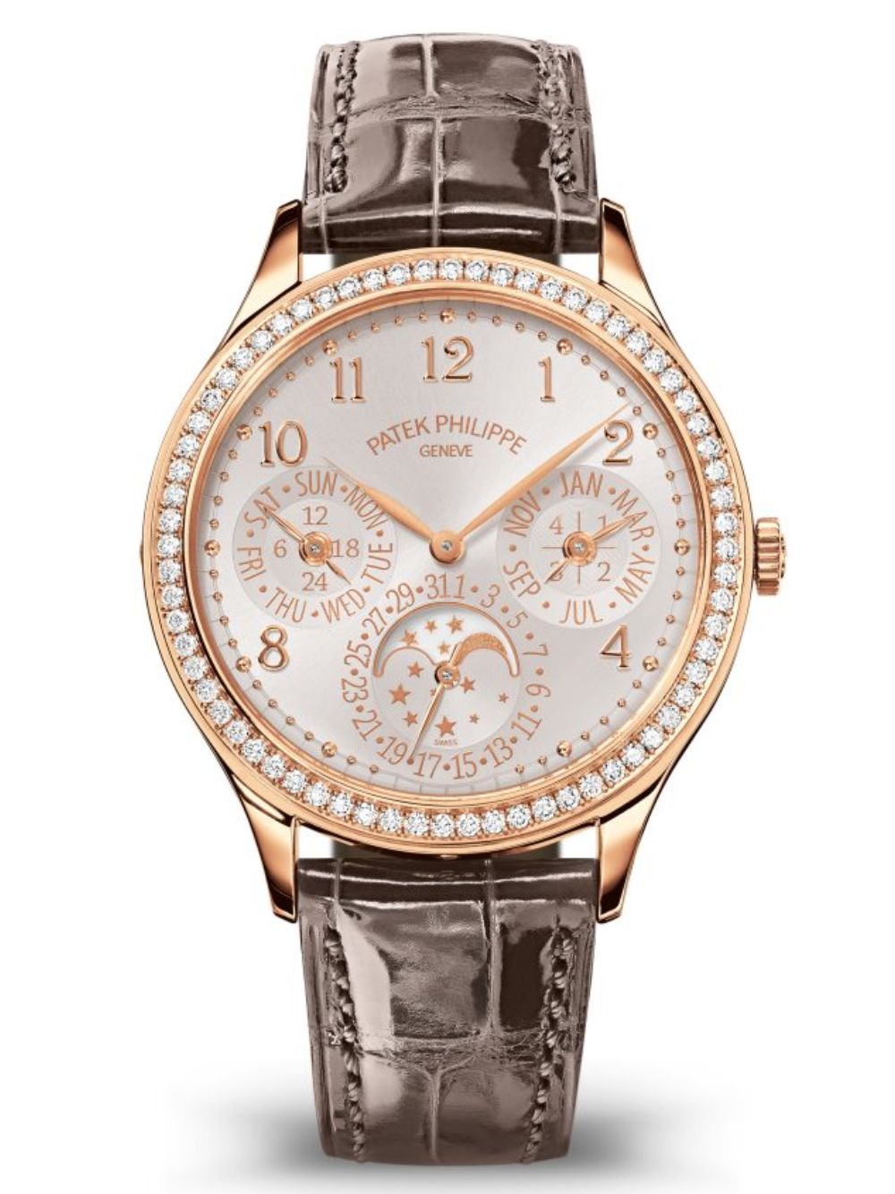 Patek Philippe, Ref. 7140R-001 Grandi Complicazioni. Orologio automatico in oro rosa con calendario perpetuo, lunetta con 68 diamanti, quadrante bianco argentato opalescente e cinturino in alligatore lucido grigio visone. Eleganza sofisticata.