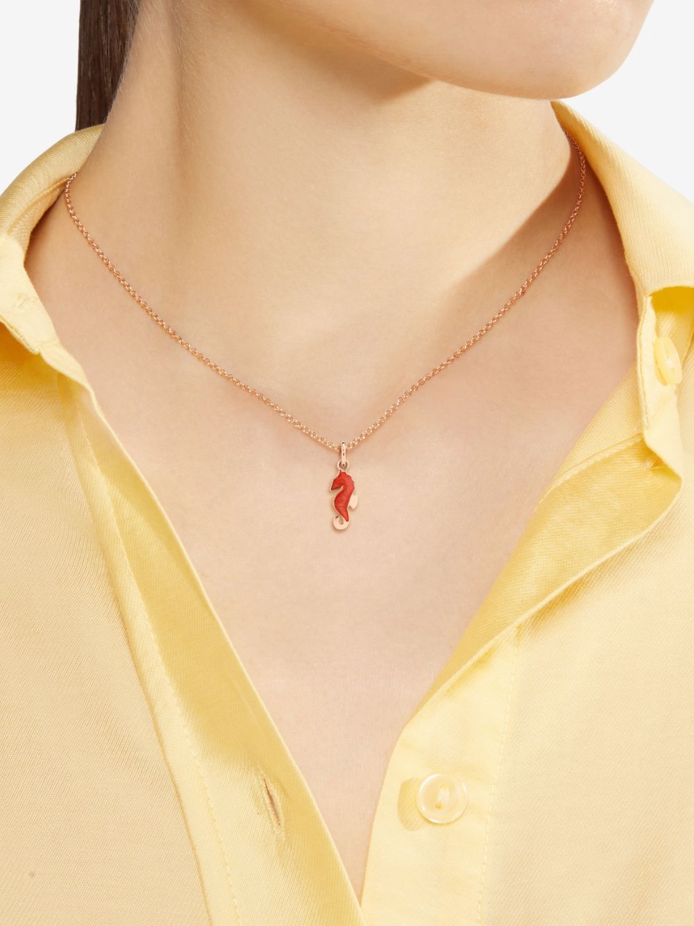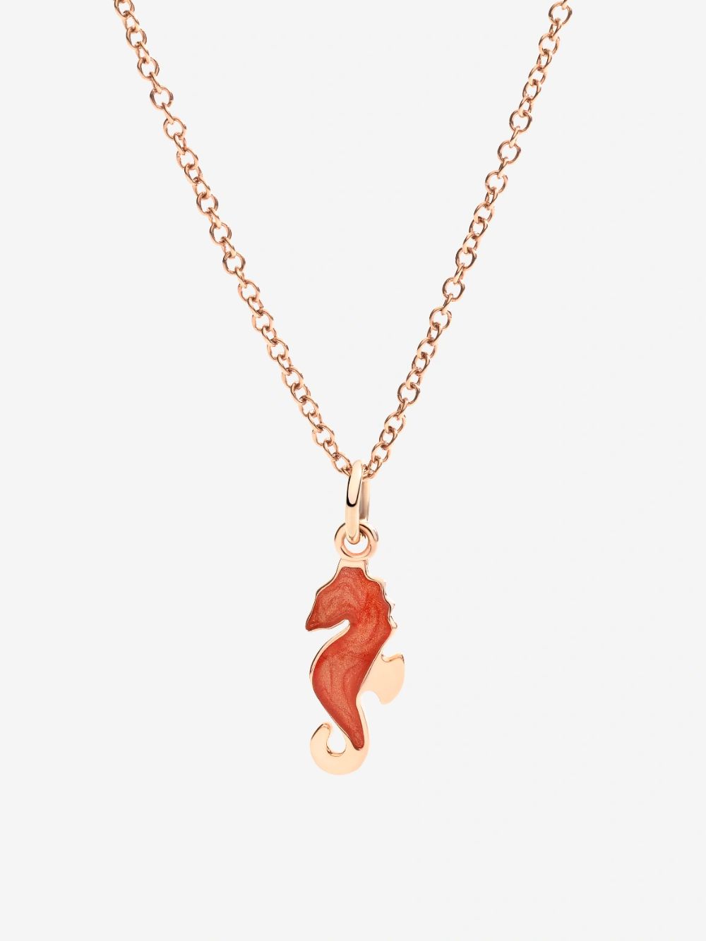 Charm cavalluccio marino DoDo in oro rosa 9k con smalto arancione effetto madreperla. Collezione Essentials. SKU: DMC4006_SEAHS_EPA9R_0. Simbolo di eleganza marina, perfetto per personalizzare collane o bracciali.