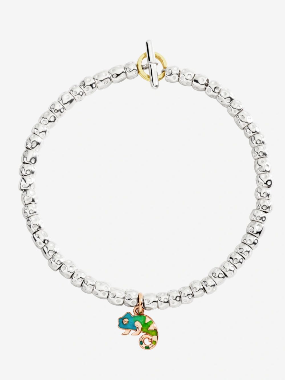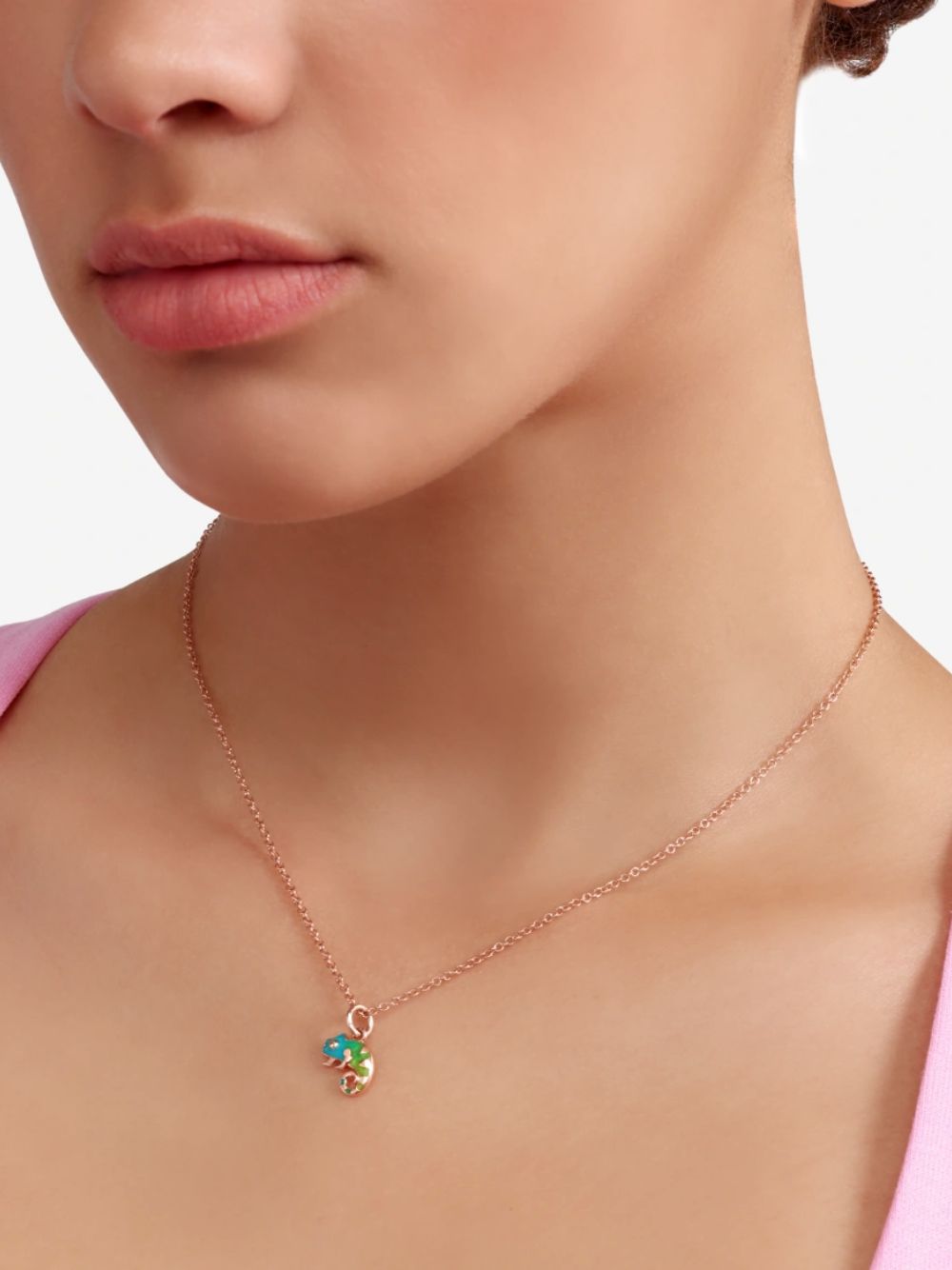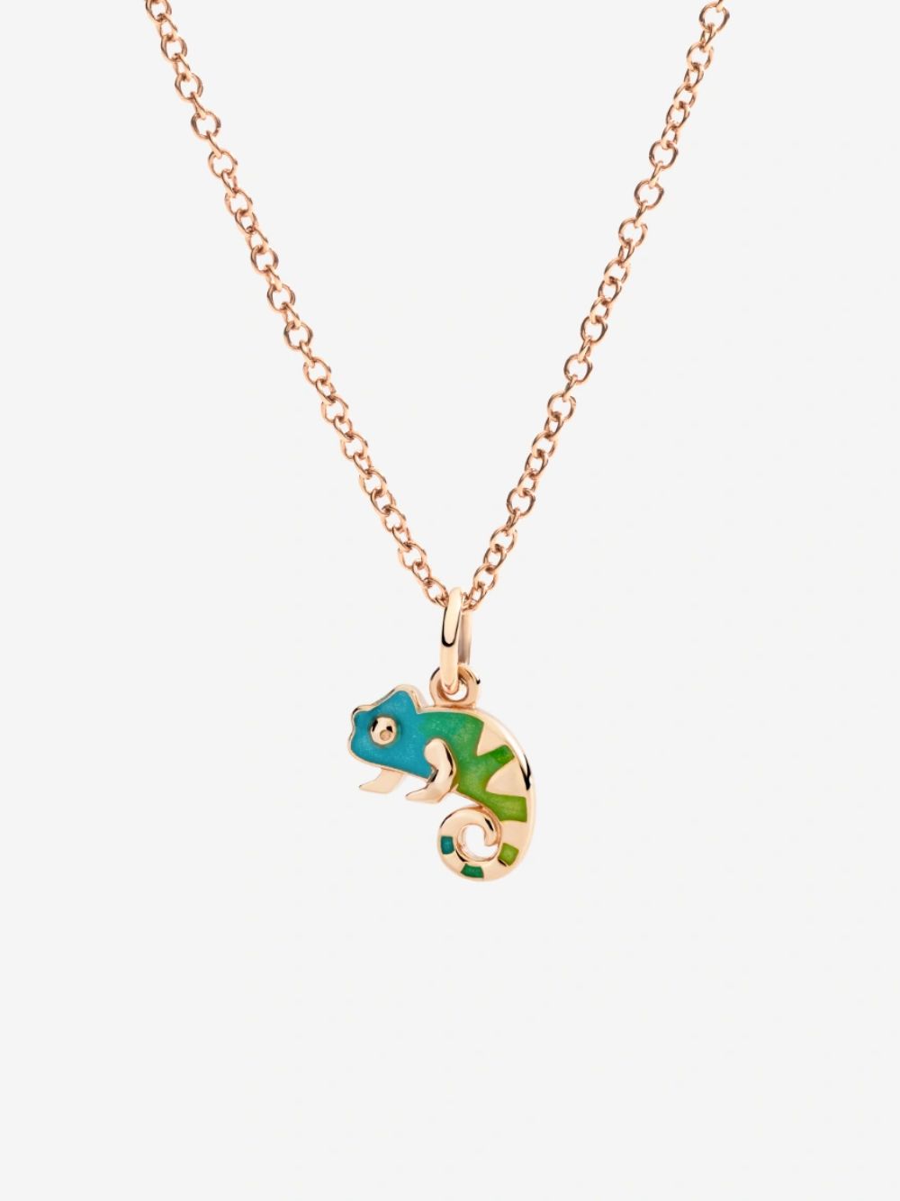 Sembra incedere cautamente il nuovo ciondolo camaleonte in oro rosa 9 K e smalto con dettagli a rilievo, occhi, zampe e coda arricciata. Lo smalto perlato, applicato a mano in tre tonalita` di verde, sfuma a partire dalla testa fino all’estremità della coda.
