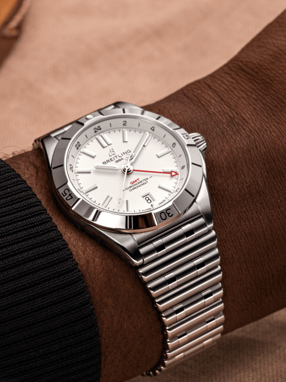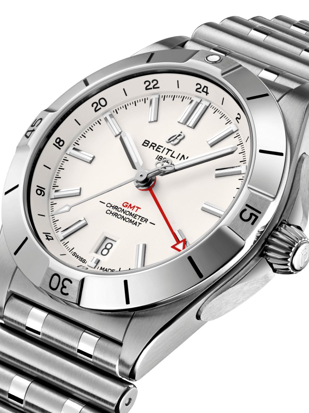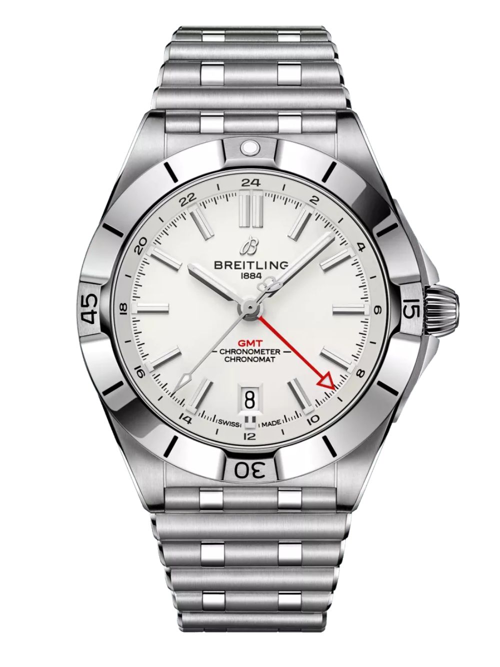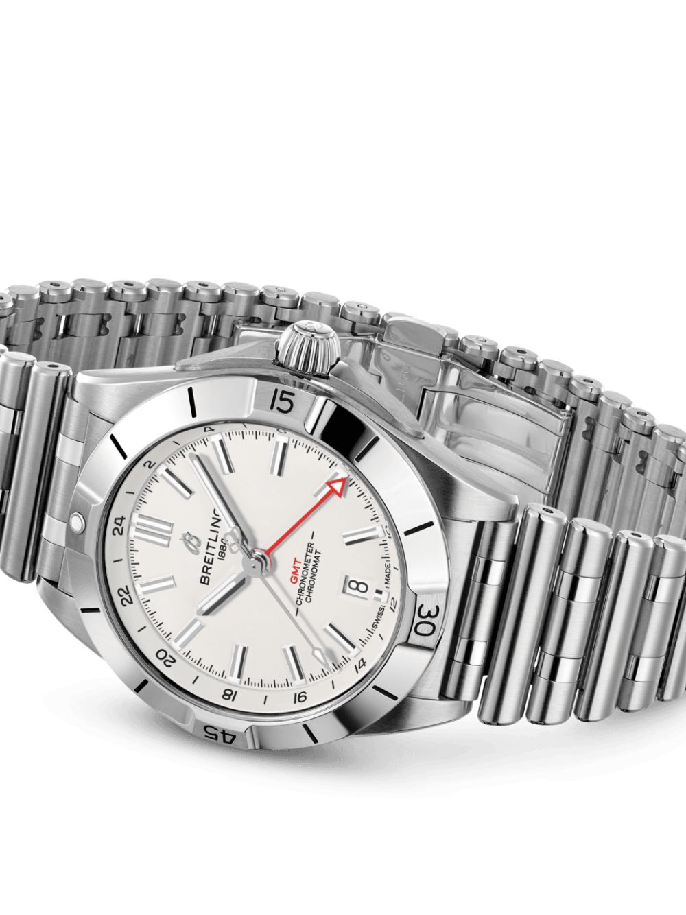 Il Chronomat Automatic GMT 40 di Breitling celebra i viaggi con il doppio fuso orario e un`estetica raffinata. Il quadrante dai colori sobri, la cassa e il bracciale in acciaio si adattano a qualsiasi look, mentre la scala delle 24 ore tono su tono mette in risalto la lancetta GMT rossa. Alimentato dal Calibro Breitling 32, offre la visualizzazione di un secondo fuso orario e indica se è giorno o notte. La corona a “cipolla” facilita la regolazione. Impermeabile fino a 200 m, è un orologio sportivo multifunzione, perfetto per cielo, terra e acqua. Ideale per qualsiasi occasione, il GMT 40 unisce robustezza e eleganza, rendendolo l`orologio da viaggio per eccellenza