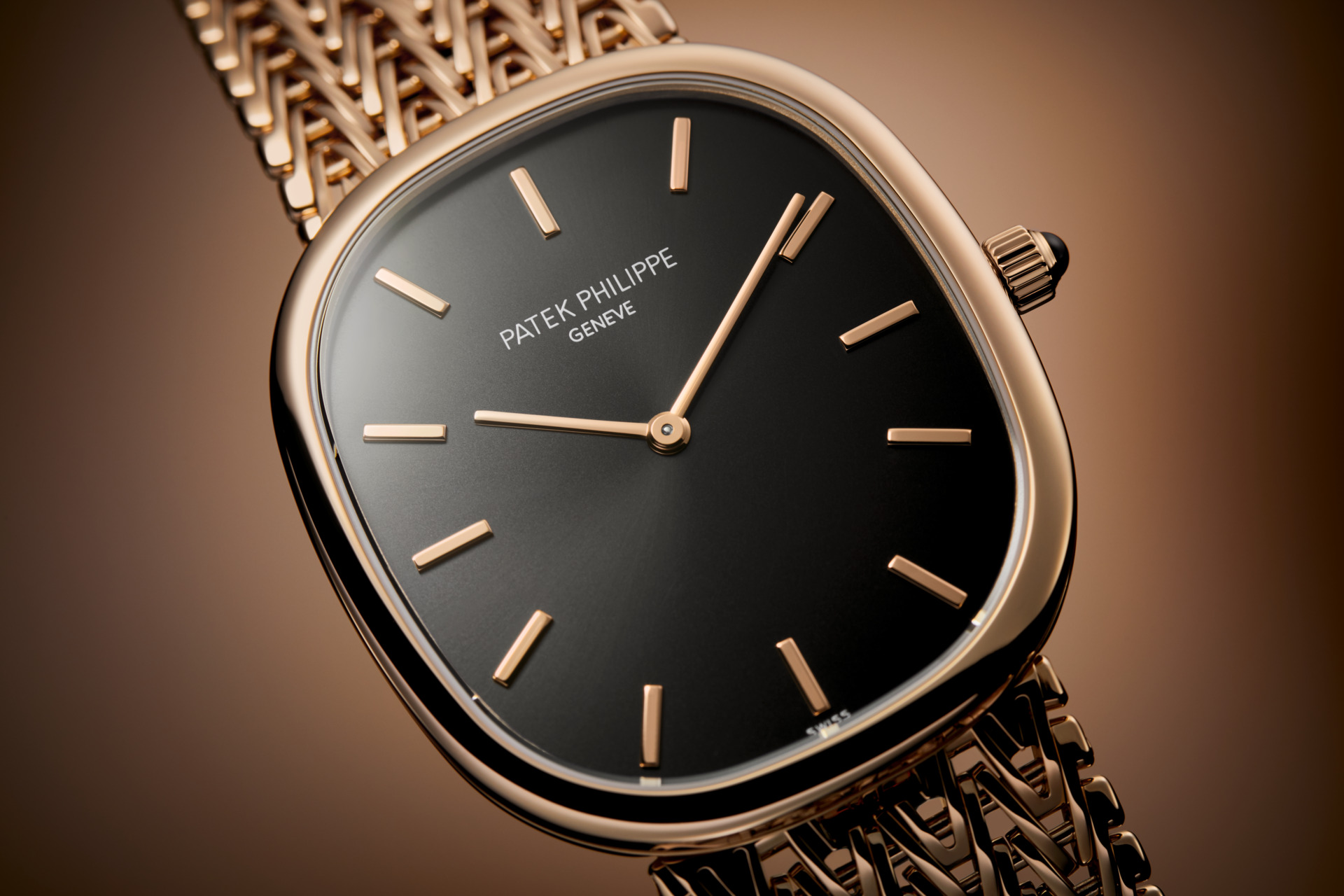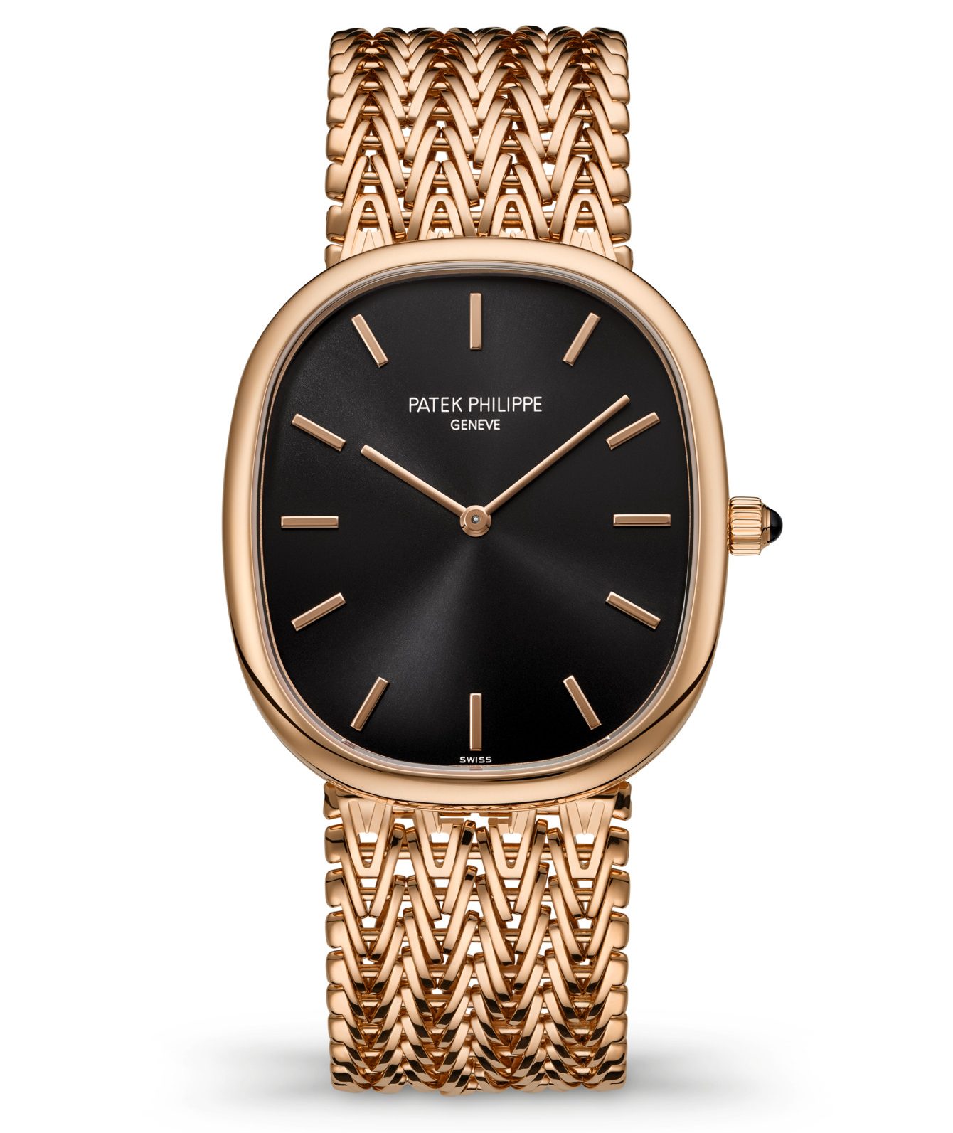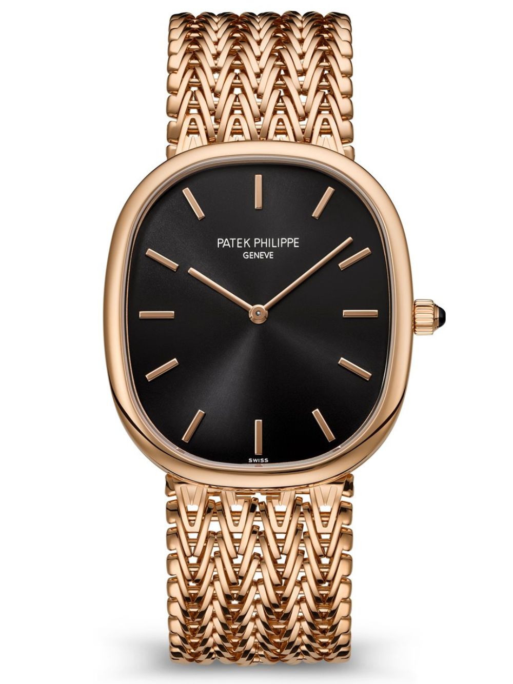 Patek Philippe, orologio, Ref. 5738/1R-001, collezione Golden Ellipse. Orologio automatico in oro rosa con quadrante nero ebano soleil, bracciale a maglie in oro rosa, e calibro ultrapiatto 240. Eleganza anni ’70 reinterpretata con raffinatezza.