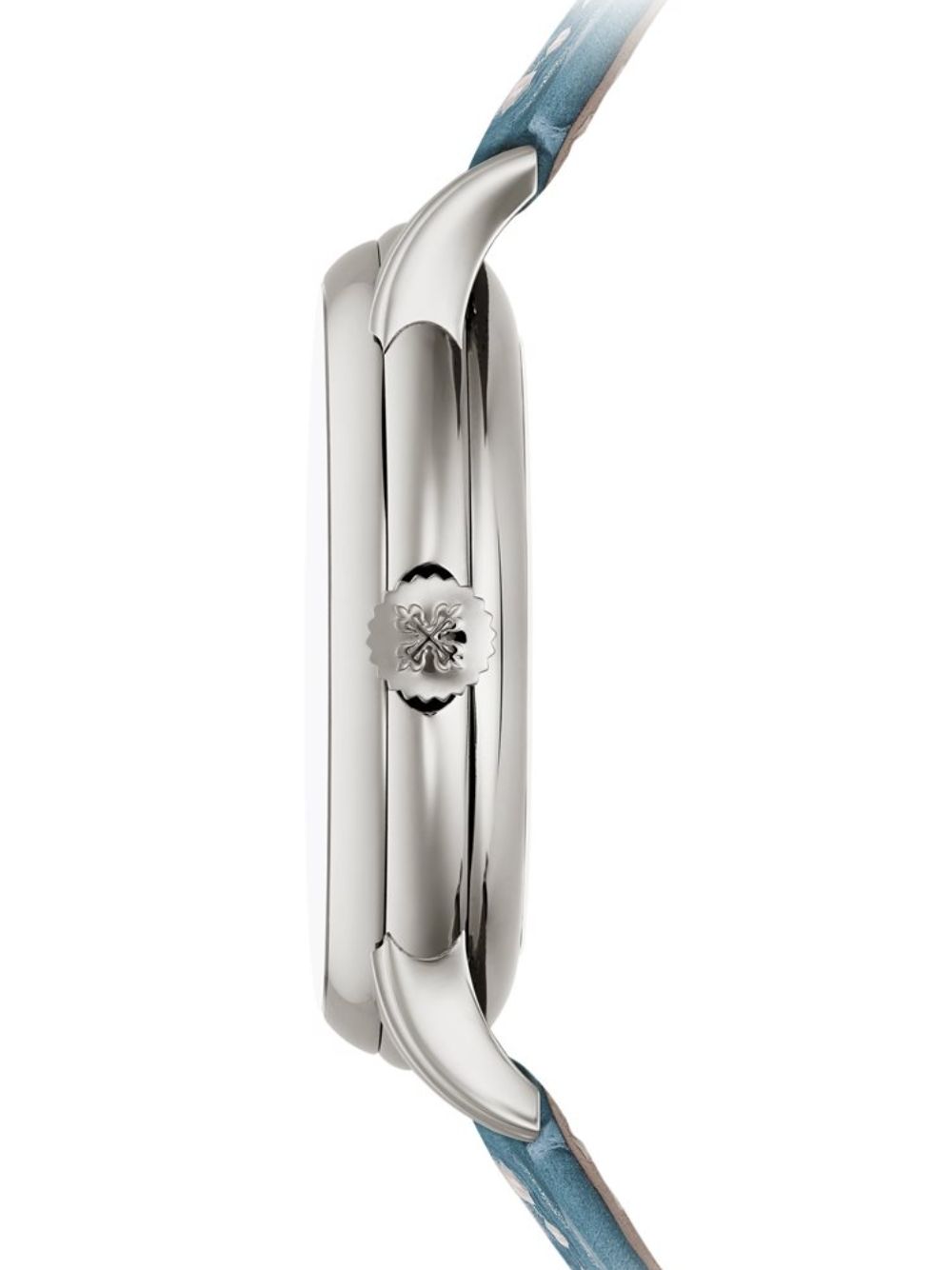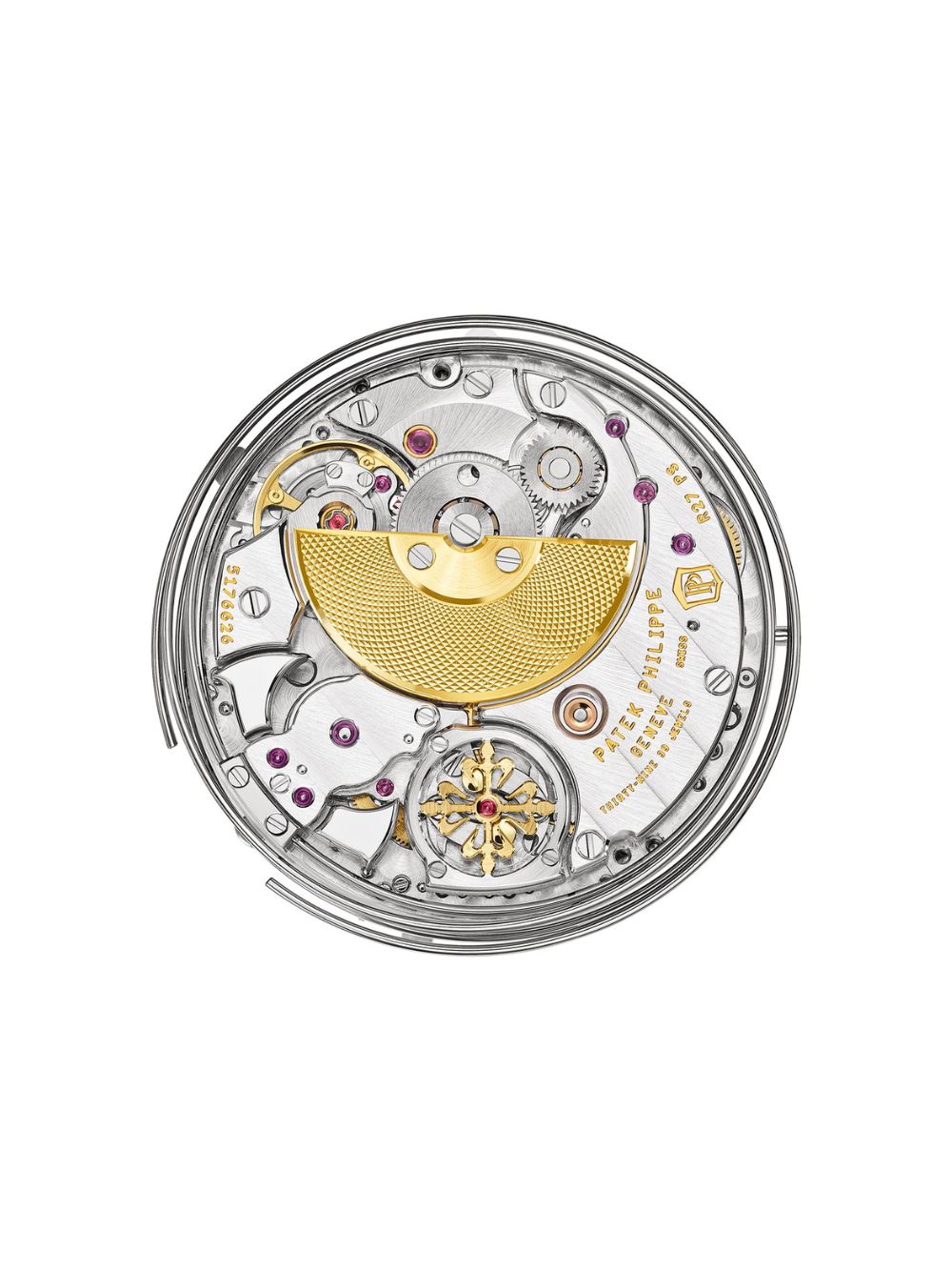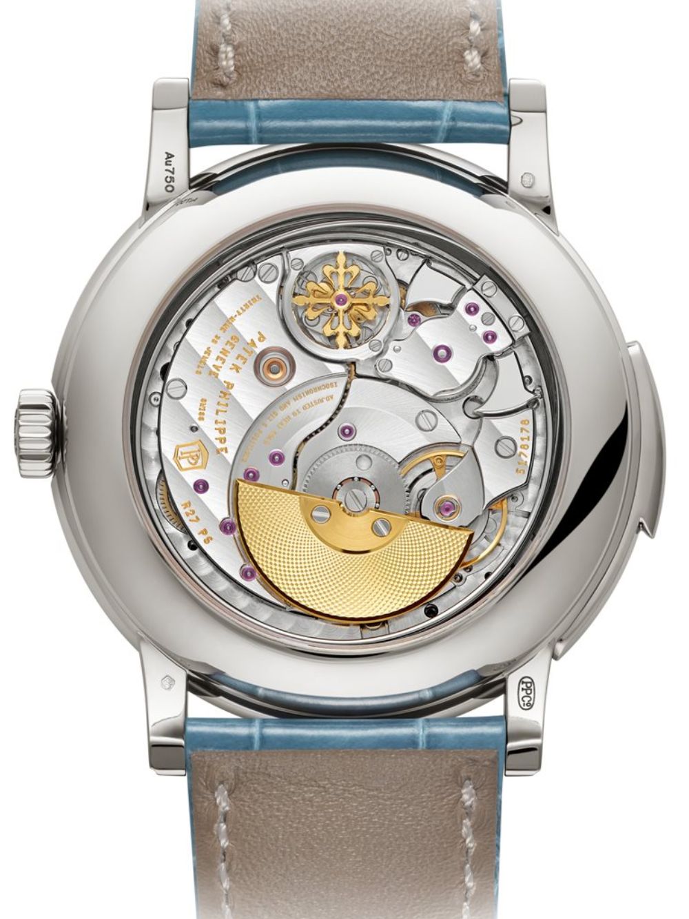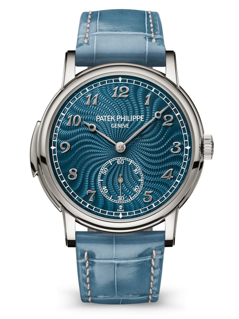 La ripetizione minuti a carica automatica Ref. 5178 si distingue per un quadrante in smalto Grand Feu blu flinqué, con una placca in oro bianco lavorata a mano con motivo guilloché a vortice e rivestita di smalto traslucido. I suoi timbri “cattedrale”, due volte più lunghi dei timbri classici, conferiscono una sonorità ricca e profonda. La nuova versione include due cinturini intercambiabili: uno in alligatore arancio lucido con cuciture blu e l’altro in alligatore blu pavone lucido con cuciture color crema.