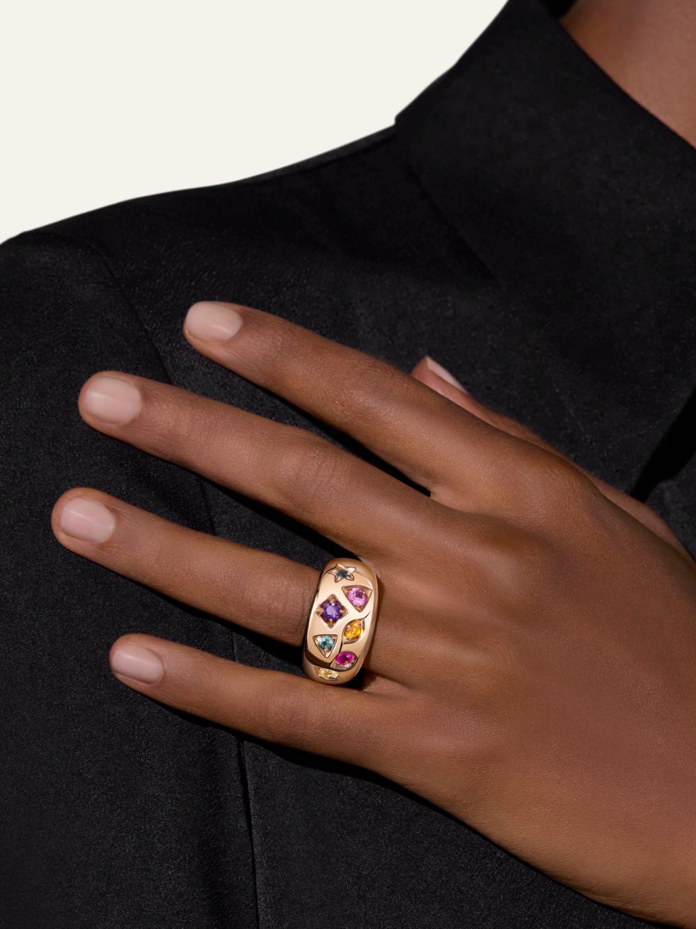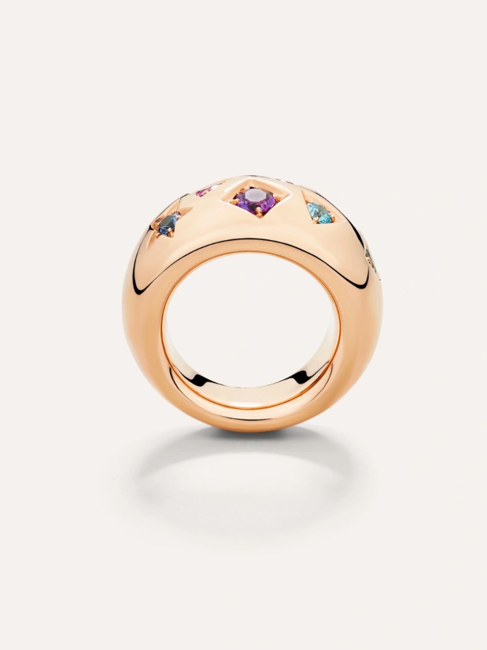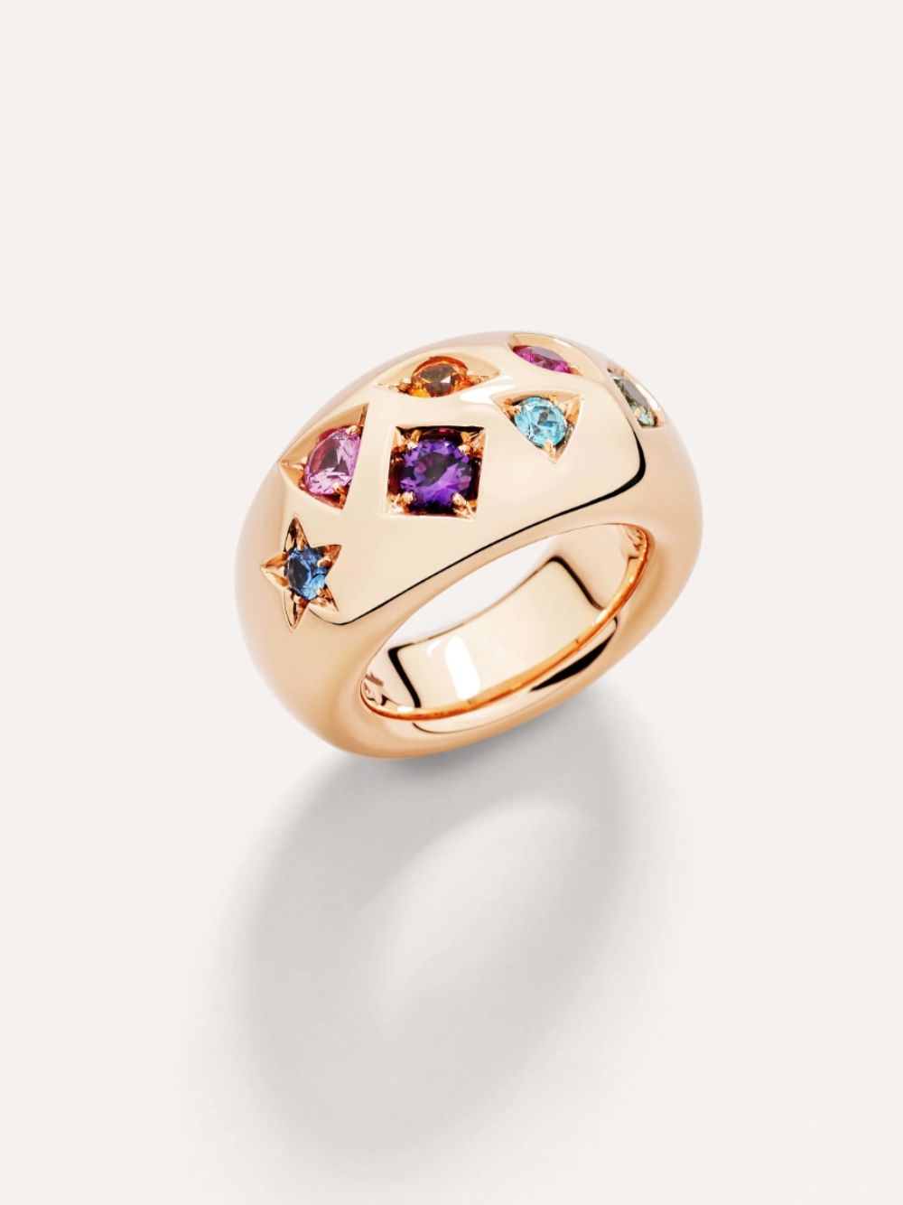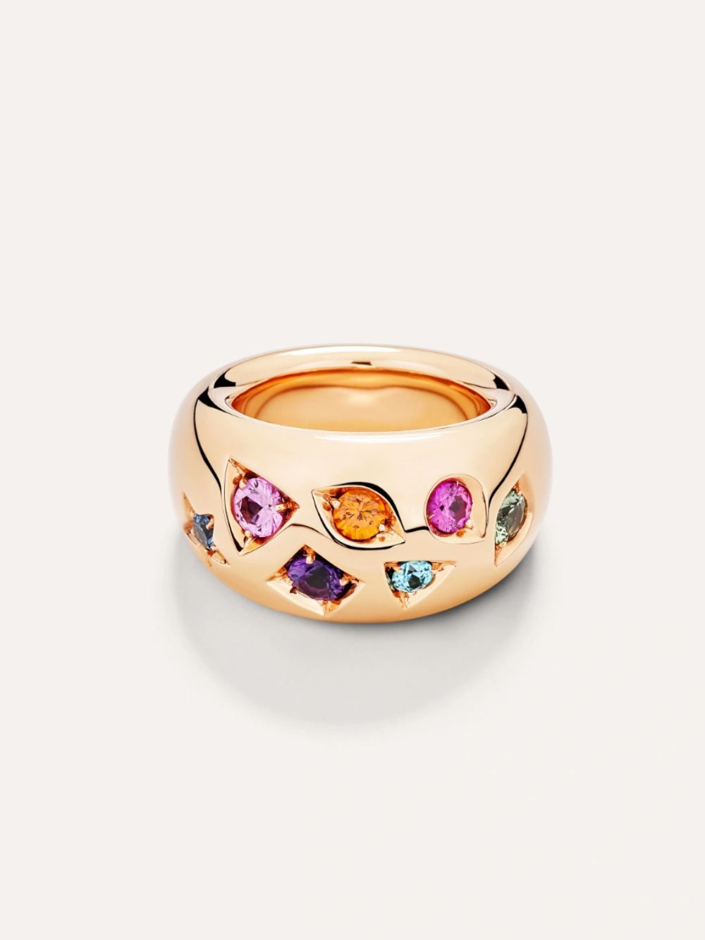 Questo anello cocktail celebra la maestria artigianale Pomellato con un mix vibrante di gemme preziose — ametista, rubino, zaffiri multicolore e zircone — incastonate in oro rosa 18kt. La tecnica fancy di incastonatura crea un raffinato effetto trompe l’oeil, esaltando la brillantezza delle pietre e il carattere unico della collezione. Un tributo alla forza e alla femminilità , in perfetto stile Iconica.