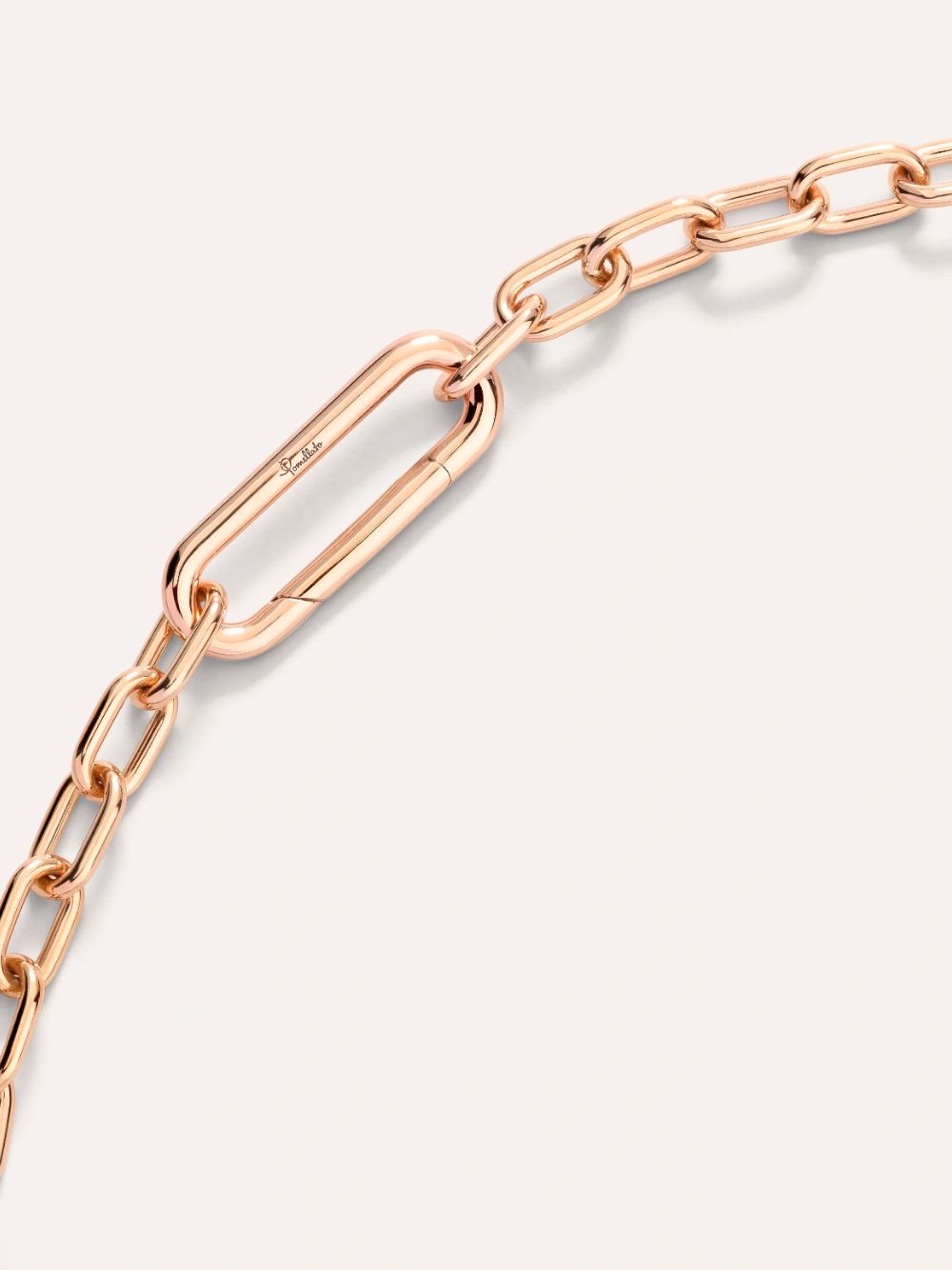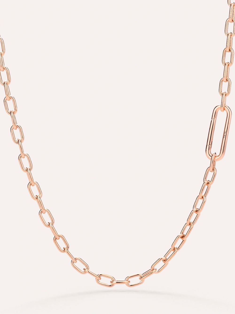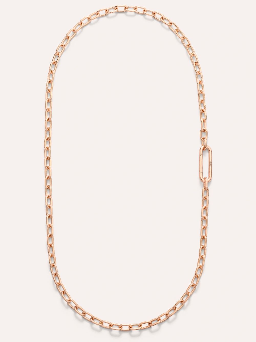 La collana a catena in oro rosa si chiude con un fermaglio a scatto nascosto nell`iconica maglia oversize che contraddistingue la collezione Iconica. Le sue linee semplici e pulite, simbolo di libertà d`espressione e fluidità di genere, emanano un fascino universale che seduce al primo sguardo. Essenziale e raffinata, questa collana celebra l`arte del design milanese, unendo eleganza e modernità in un gioiello irresistibile.