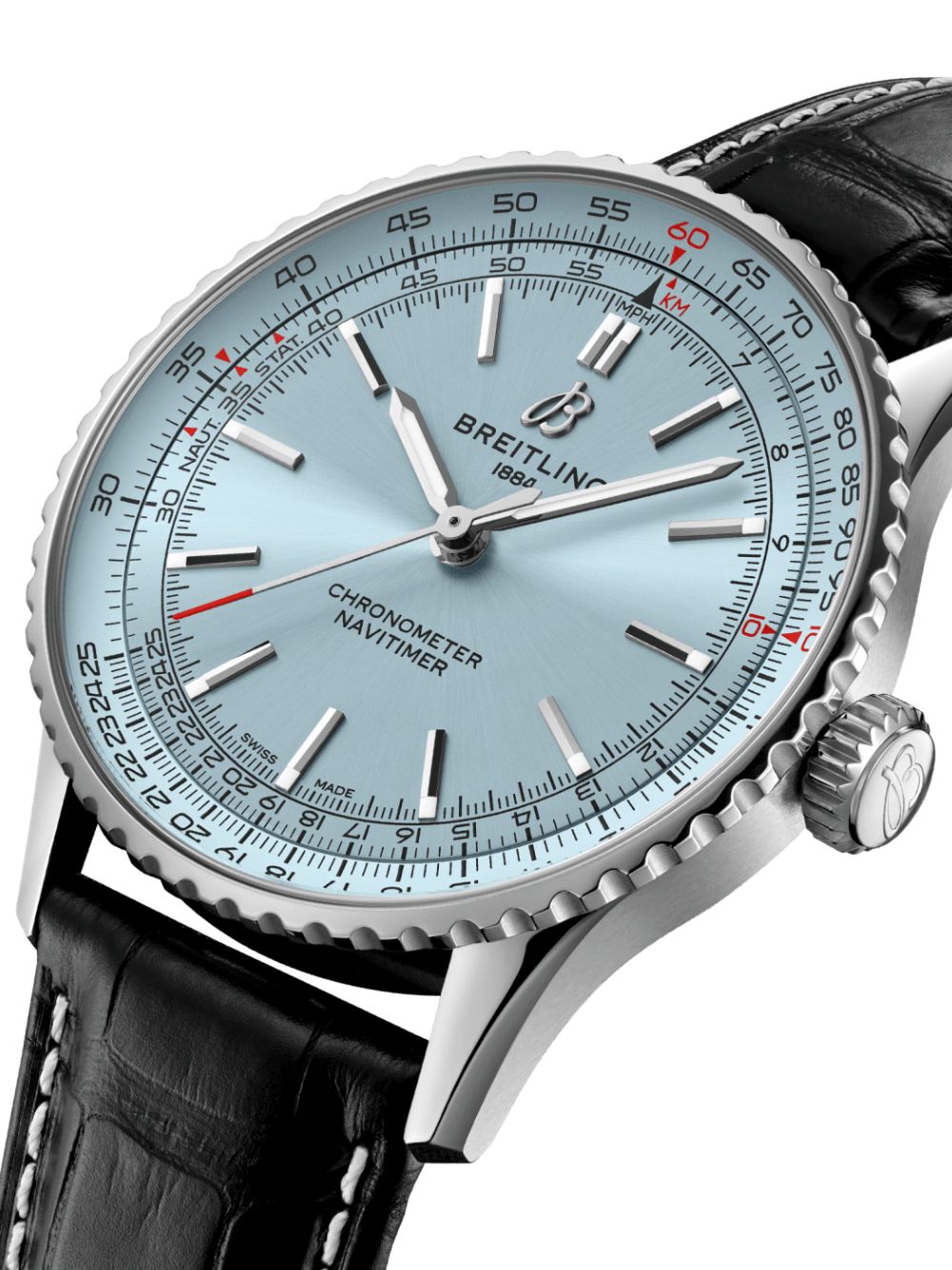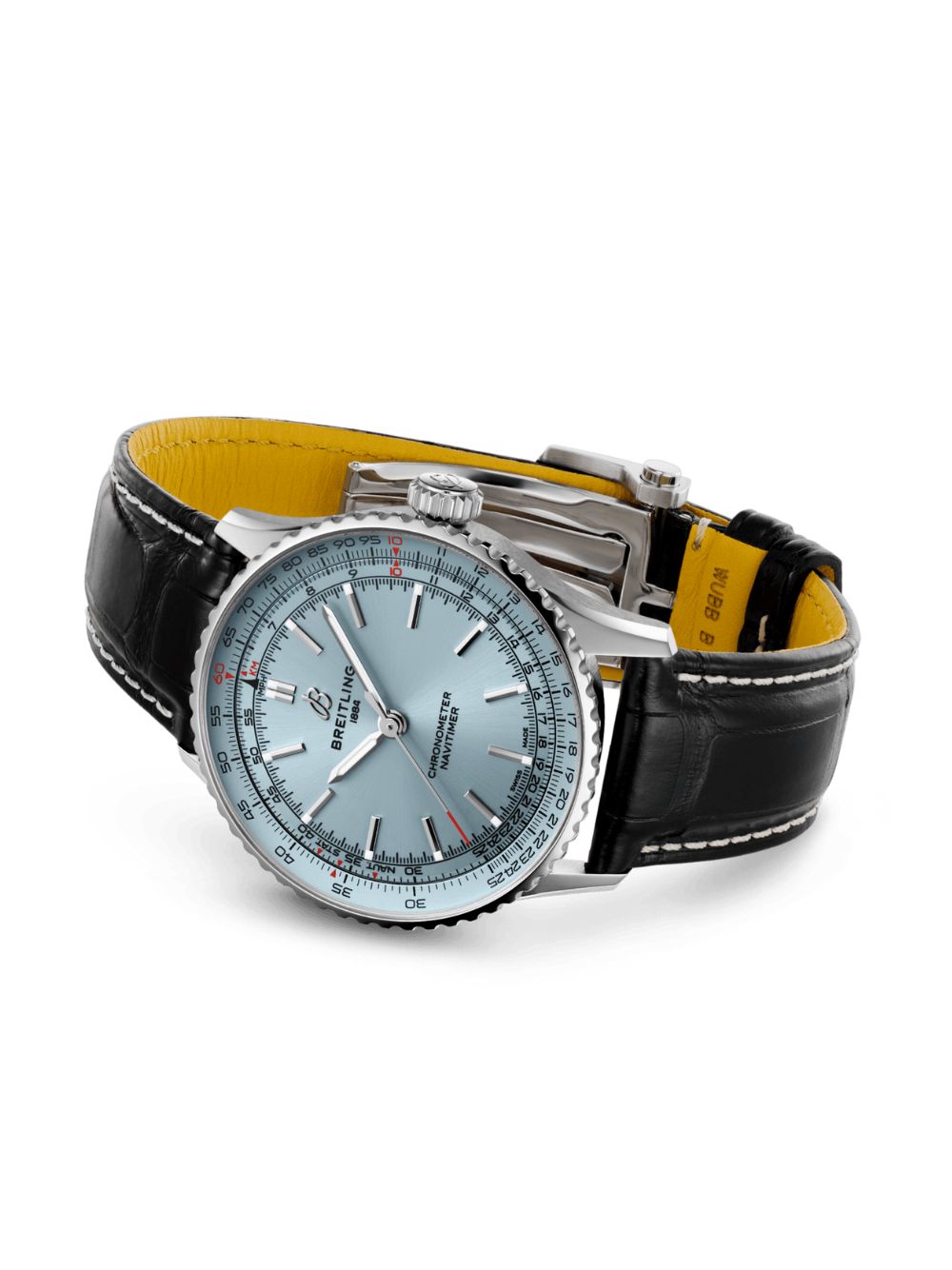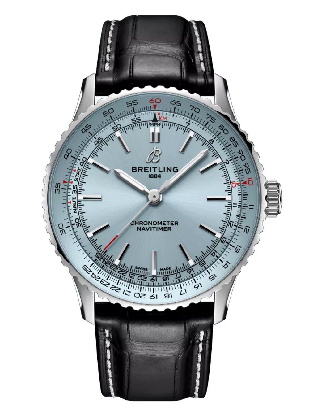 l Navitimer di Breitling, nato nel 1952 per i piloti, è un`icona dell`orologeria. Le versioni Automatic e Automatic GMT 41 mantengono l`estetica distintiva del Navitimer senza il cronografo. La scala a 24 ore del GMT e il design pulito dell`Automatic mettono in risalto il regolo calcolatore. La lunetta a tacche alterna finiture lucide e spazzolate. Disponibile con cinturini in pelle di coccodrillo o bracciali a farfalla, in acciaio inox o oro rosso 18 carati, combina tradizione e innovazione per gli amanti dello stile.
