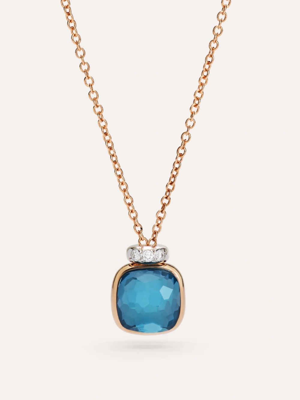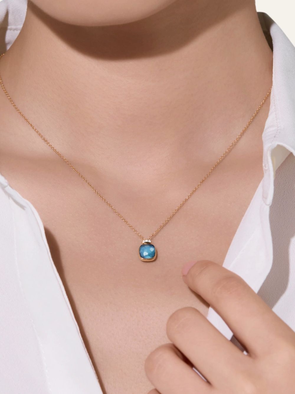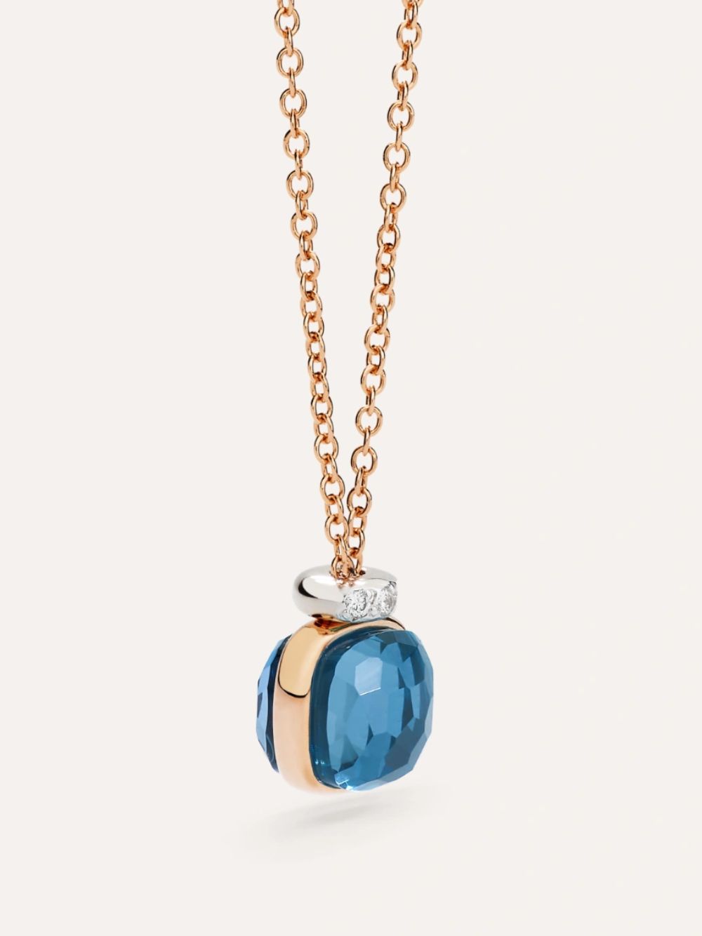 La collezione Nudo di Pomellato è il simbolo di un design audace e iconico, che libera le gemme dalle tradizionali montature per esaltarne la bellezza. Ogni gioiello racconta una storia di innovazione e maestria artigianale. La nuova versione Nudo Mini offre una reinterpretazione raffinata e più piccola, ideale per l`uso quotidiano. Il pendente Nudo Mini presenta un topazio London blue tagliato a clessidra, che richiama le acque crepuscolari, e una catena in oro rosa decorata con diamanti bianchi. La scala ridotta del pendente mantiene il carattere sofisticato del design originale, rendendo il gioiello versatile e adatto sia di giorno che di sera.