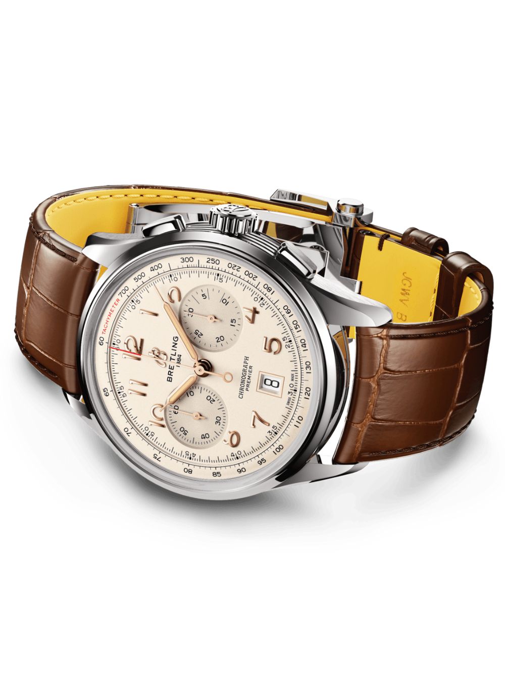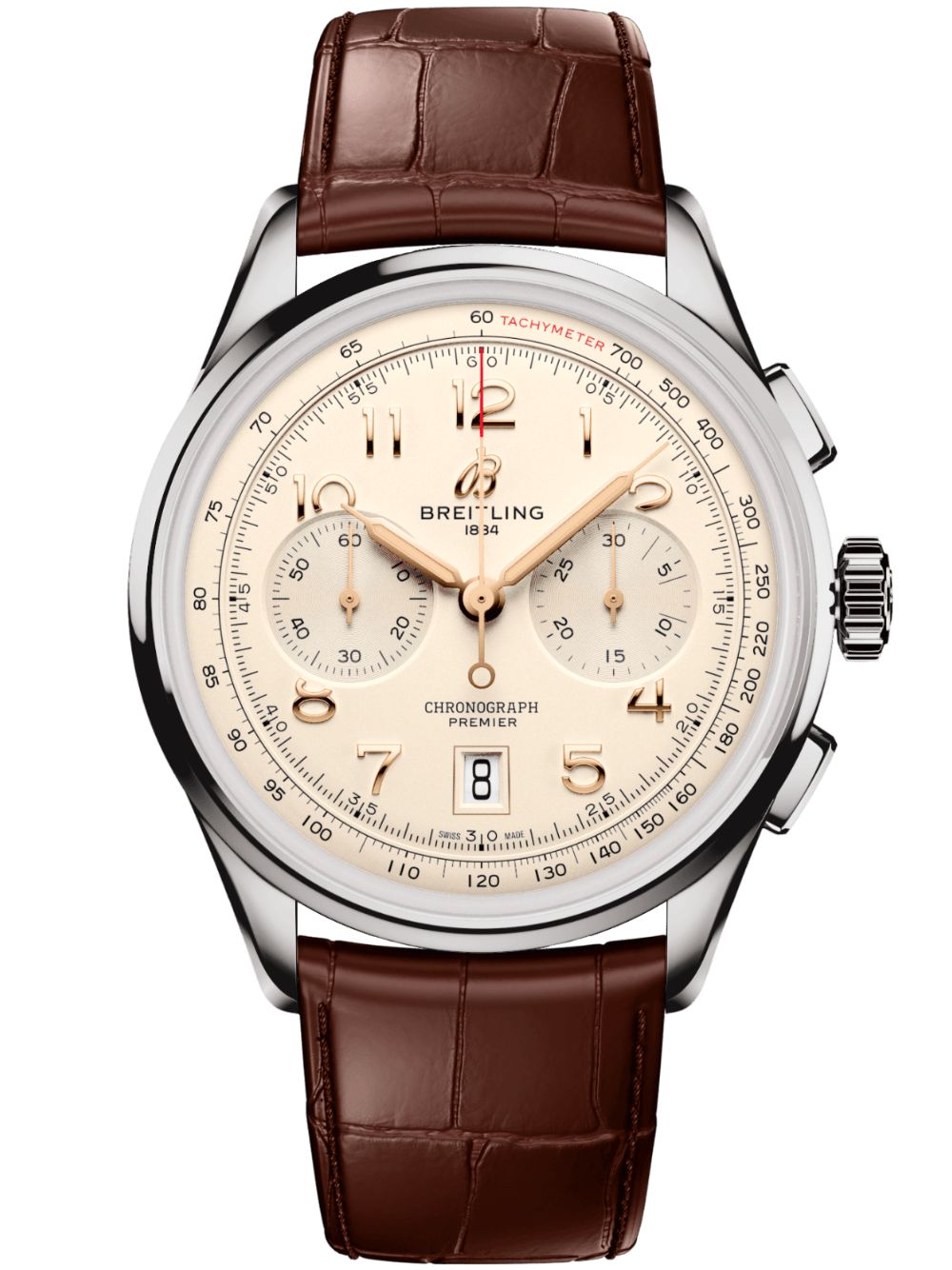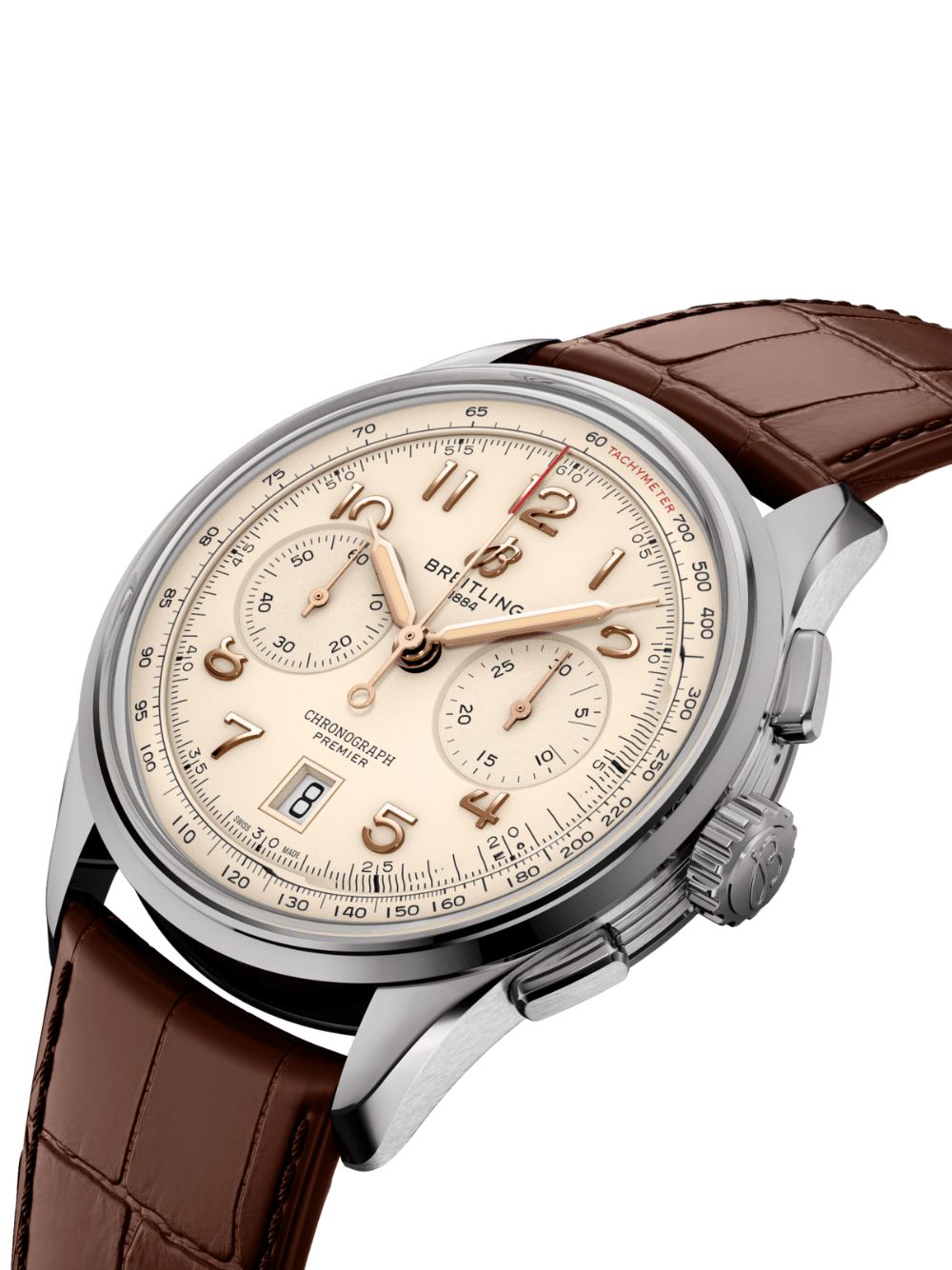 Negli anni `40, Willy Breitling creò il Premier, un cronografo elegante e funzionale per un`era di ottimismo. La versione moderna mantiene dettagli vintage come la lunetta liscia, il quadrante con doppio registro, i pulsanti rettangolari e i numeri arabi applicati. Il Premier B01 Chronograph 42 offre vari colori di quadrante e materiali della cassa, con cinturini in pelle di coccodrillo o bracciali in metallo. Equipaggiato con il calibro Breitling 01 certificato COSC, garantisce massima precisione, affidabilità e funzionalità.