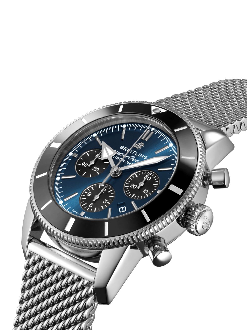 Ispirato al Superocean degli anni `50, il Superocean Heritage unisce design iconico e modernità . Sportivo ed elegante, presenta lancette triangolari e una lunetta in ceramica lucida. Disponibile in acciaio inossidabile e oro rosso 18 carati, offre quadranti in nero, blu, argento o verde. Con bracciale a maglie o cinturino in caucciù, è alimentato dal Calibro Breitling 01, un cronometro certificato COSC.