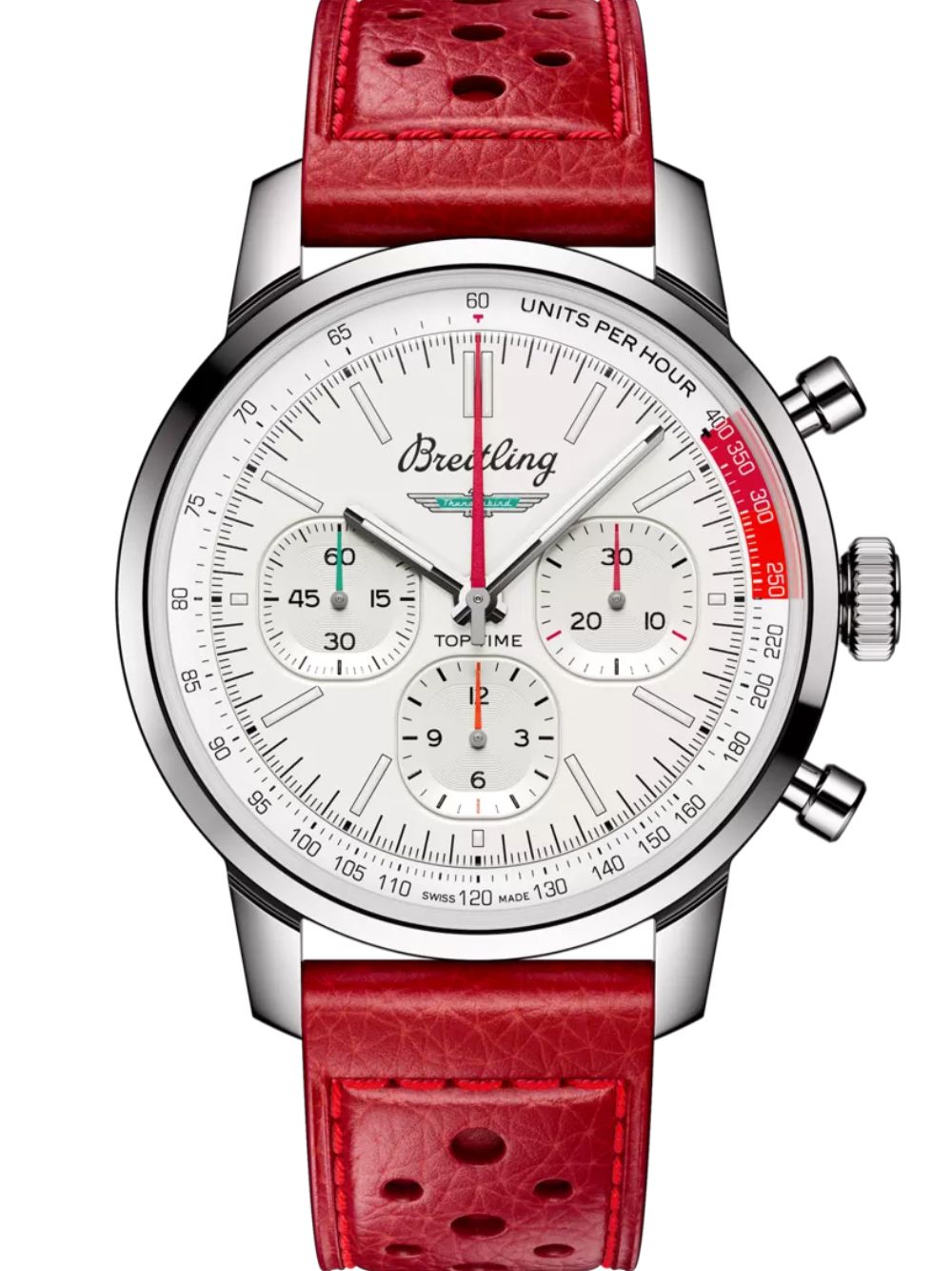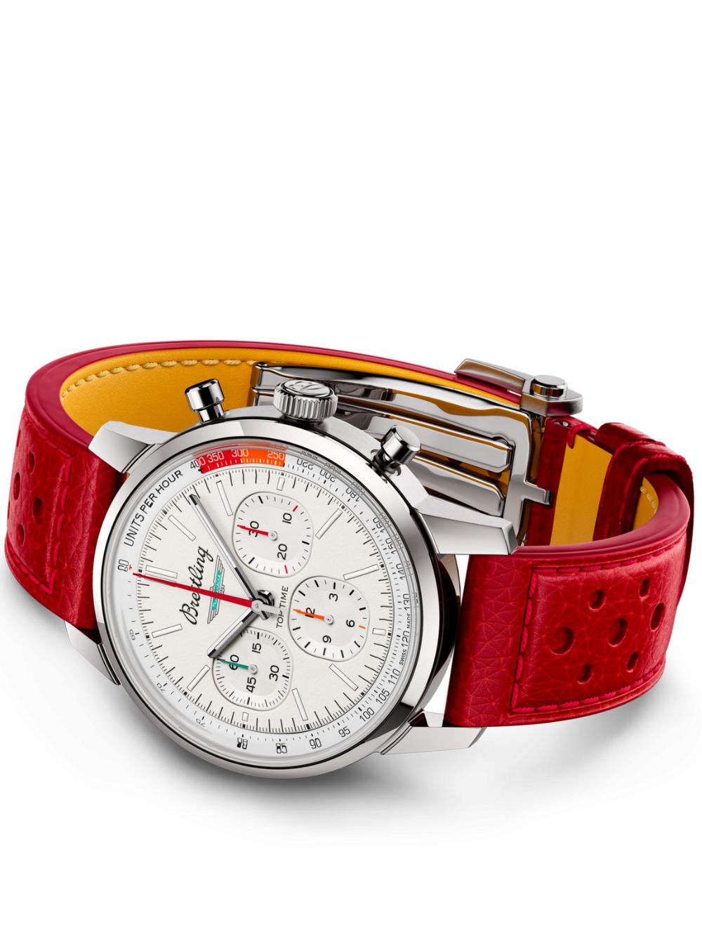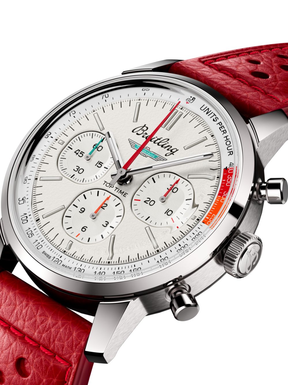 Gli anni ’60 sono stati un decennio di sperimentazione, divertimento e libertà, caratterizzato dalla passione per la velocità su moto e auto sportive. Willy Breitling percepì questo spirito e progettò il cronografo Top Time per catturare l`energia dell`epoca. Oggi, Breitling continua questa tradizione collaborando con iconici marchi automobilistici per creare i design Top Time. La Ford Thunderbird, presentata nel 1954, era una cabriolet divertente e lussuosa con un design distintivo e una struttura solida, nota per la sua iconica pinna posteriore. Il Top Time B01 Ford Thunderbird si ispira a questa auto classica, con colori e emblemi fedeli, un cinturino in pelle stile racing e dettagli vintage sui quadranti. All`interno, batte il movimento Breitling 01, un gioiello di ingegneria.