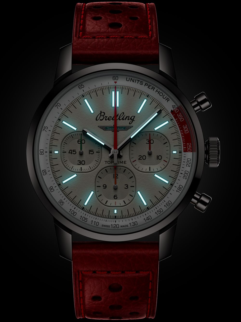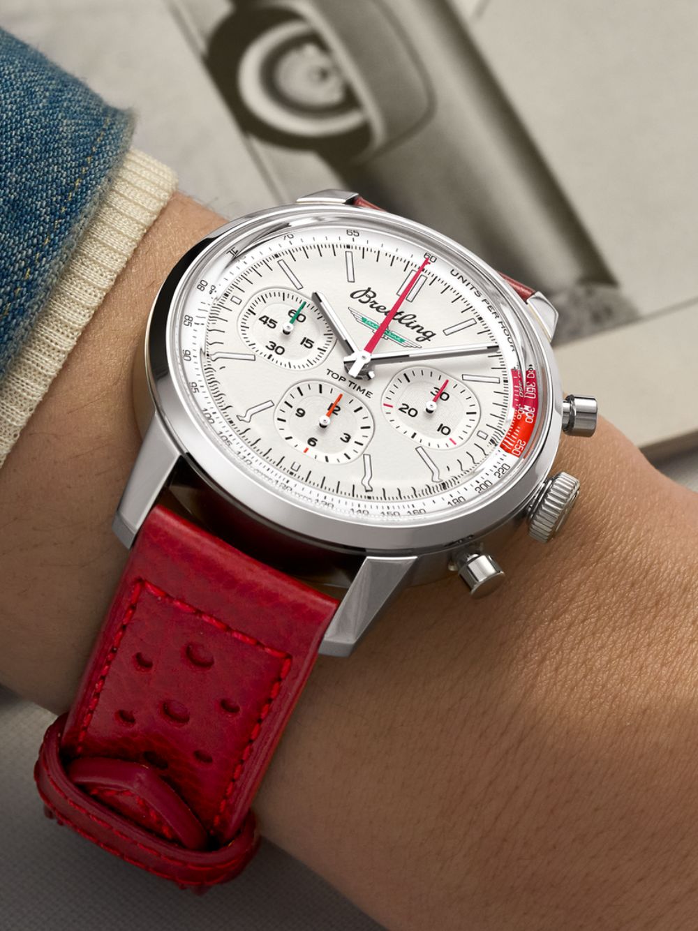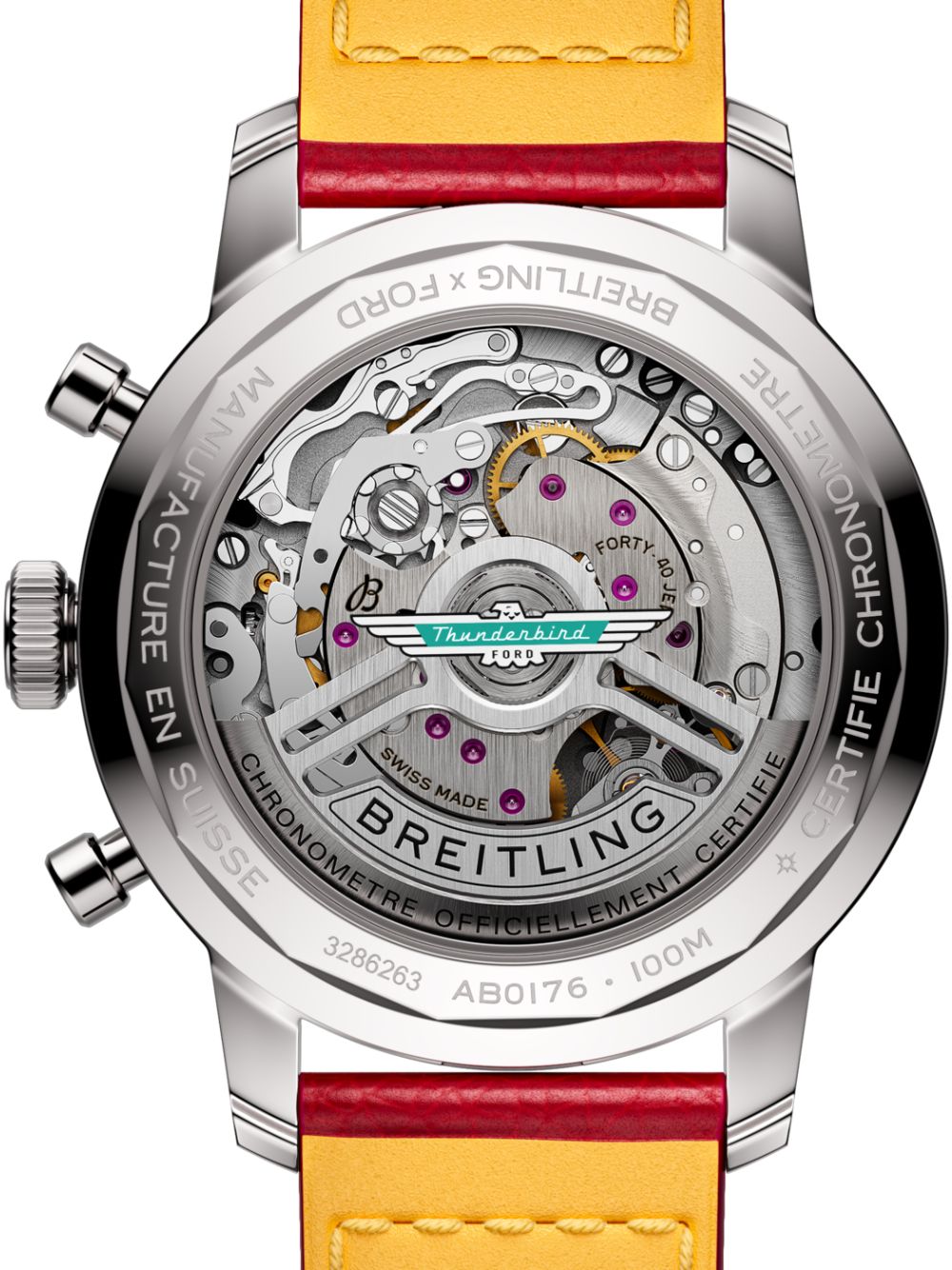 Gli anni ’60 sono stati un decennio di sperimentazione, divertimento e libertà, caratterizzato dalla passione per la velocità su moto e auto sportive. Willy Breitling percepì questo spirito e progettò il cronografo Top Time per catturare l`energia dell`epoca. Oggi, Breitling continua questa tradizione collaborando con iconici marchi automobilistici per creare i design Top Time. La Ford Thunderbird, presentata nel 1954, era una cabriolet divertente e lussuosa con un design distintivo e una struttura solida, nota per la sua iconica pinna posteriore. Il Top Time B01 Ford Thunderbird si ispira a questa auto classica, con colori e emblemi fedeli, un cinturino in pelle stile racing e dettagli vintage sui quadranti. All`interno, batte il movimento Breitling 01, un gioiello di ingegneria.